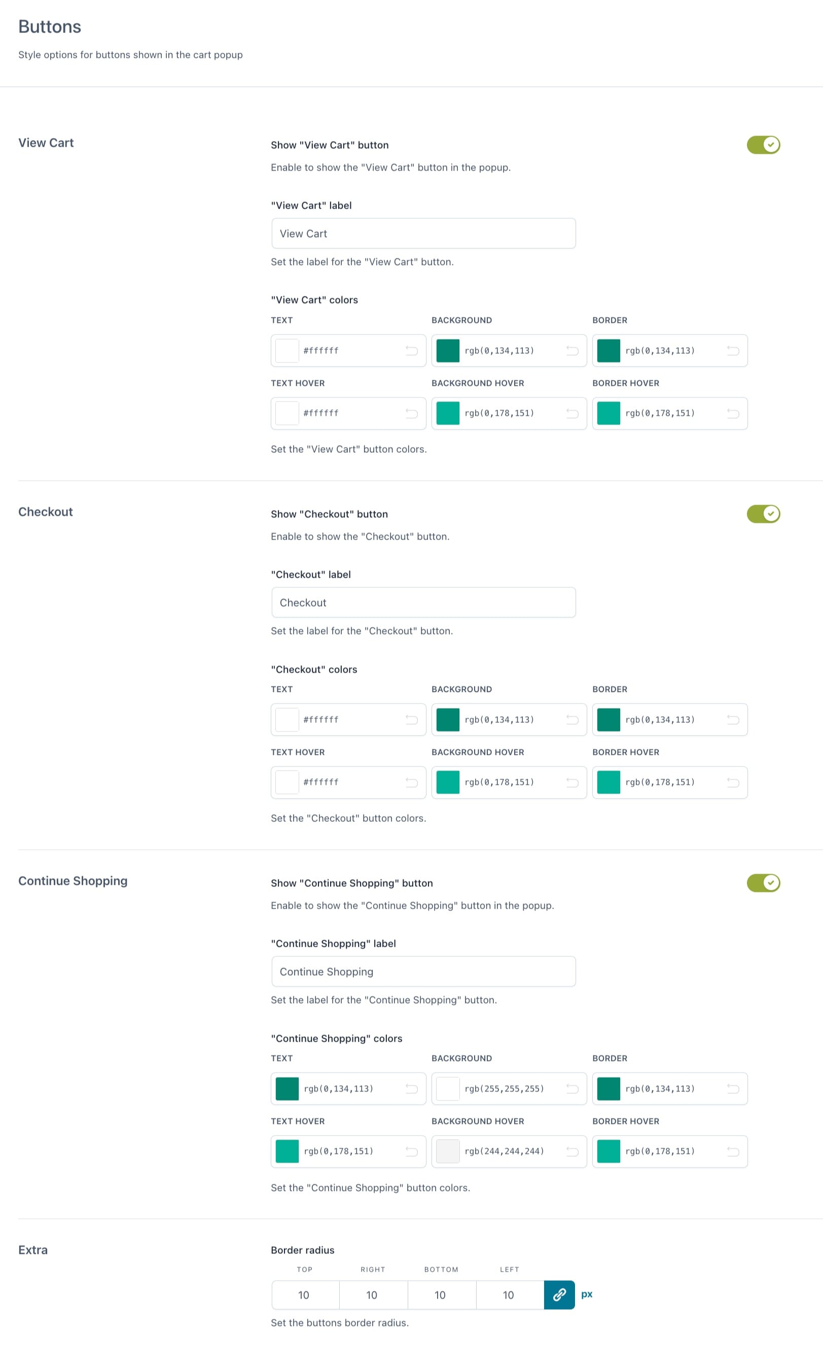 For the popup, you can choose whether or not to show the “View cart” button (redirecting users to the cart page), the “Proceed to Checkout” button (redirecting users to the checkout page), and the “Continue shopping” one (that closes the popup and lets them keep browsing products). For every button, you will be able to customize text and colors.