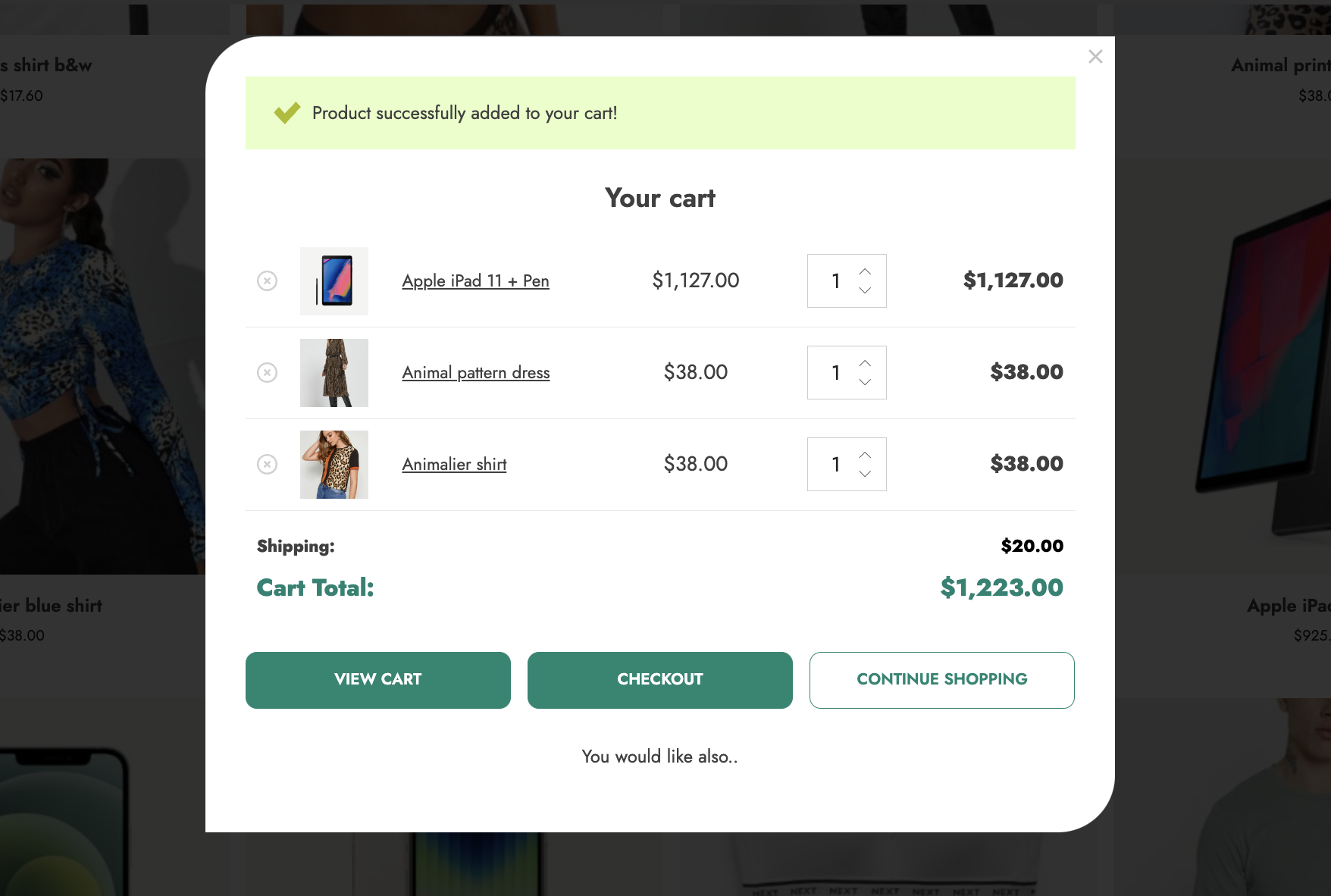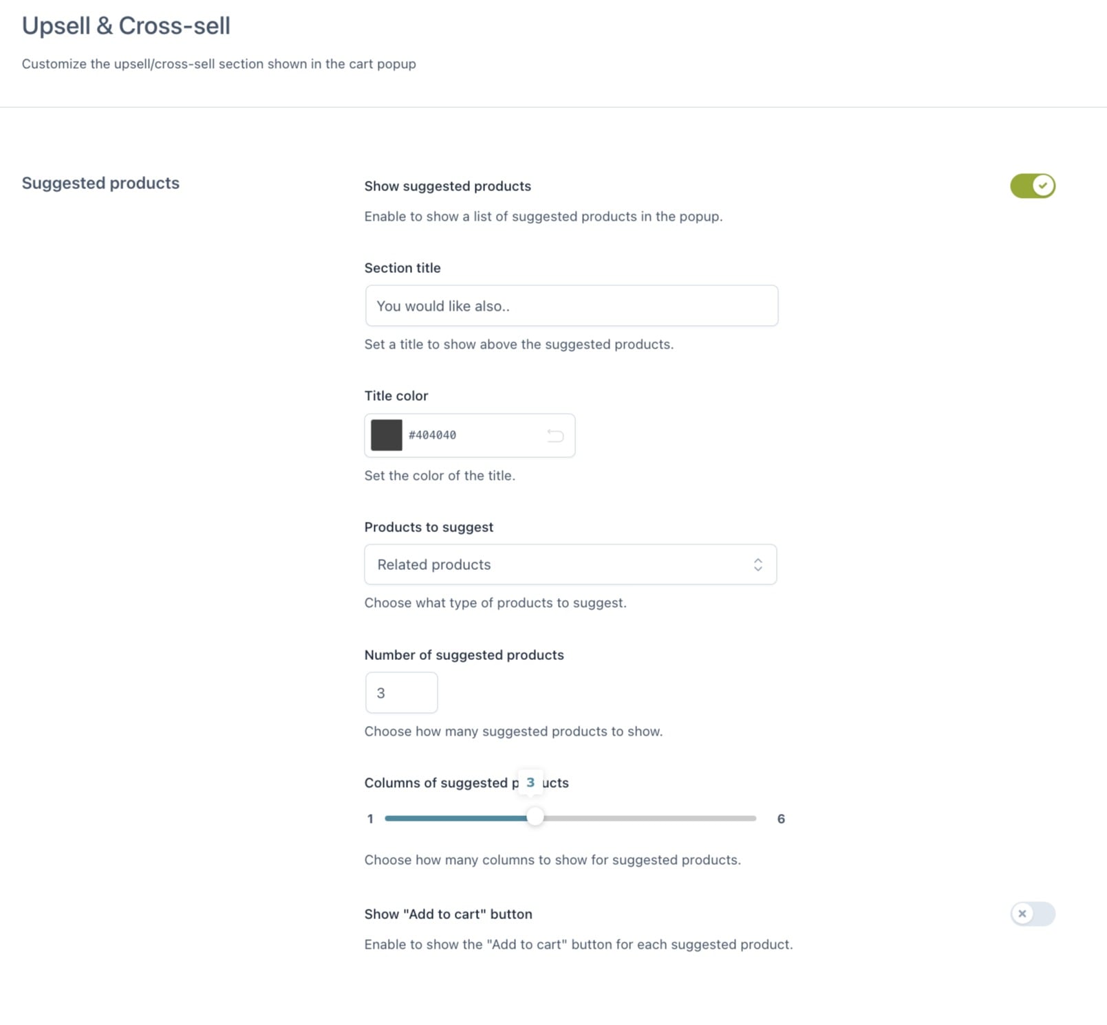 If you want, you can also include an up-sell section in the popup window. You can set up the number of products to show and which type: up-sells, cross-sells, or related products – the plugin will automatically select which products will be displayed based on the products in the cart. Alternatively, you can pick specific products of your choice and make sure these are always displayed.