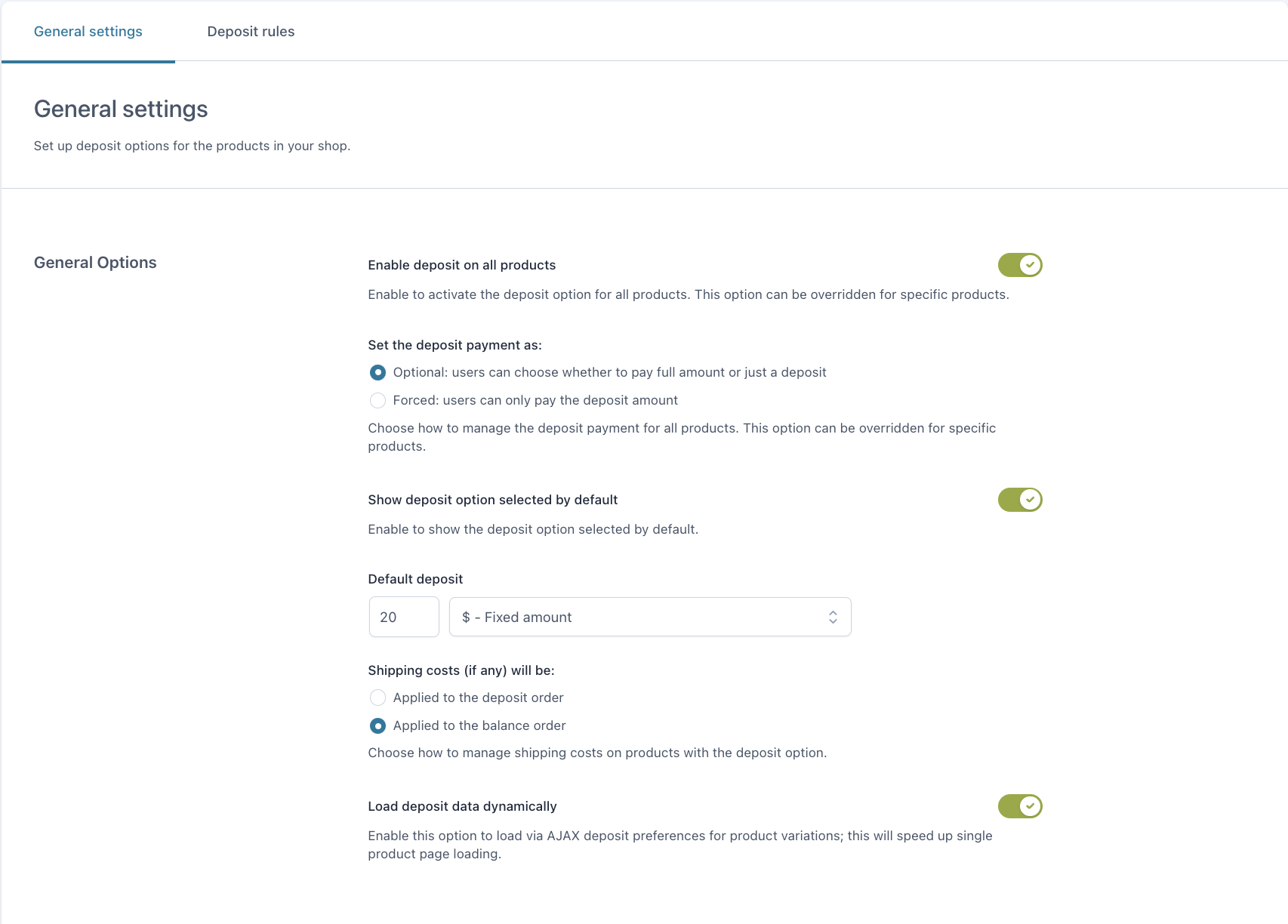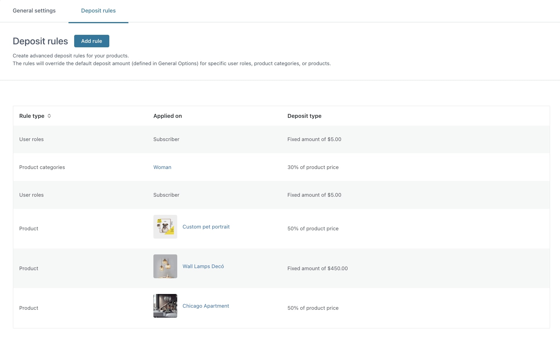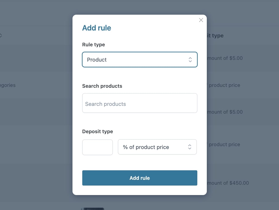 • Create advanced rules to set different deposit amounts for specific products or categories New