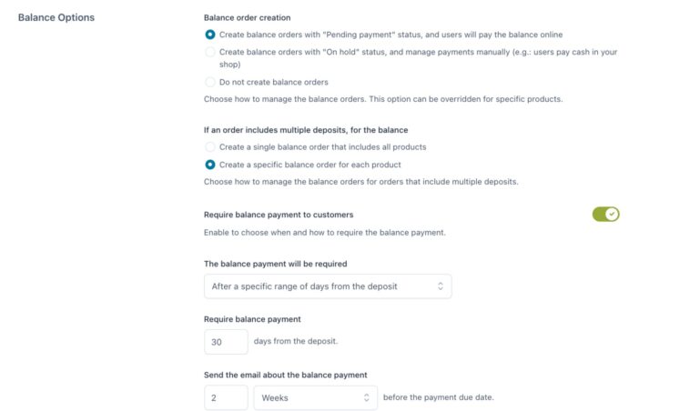 If you want the balance order to be paid online and through WooCommerce, you can decide when the payment has to be made. You can set a specific date by selecting it from the calendar (e.g. the balance order has to be paid by December 10th) or set a time range from the moment the deposit is paid for (e.g. the balance order has to be paid within the 90 days following the product reservation).