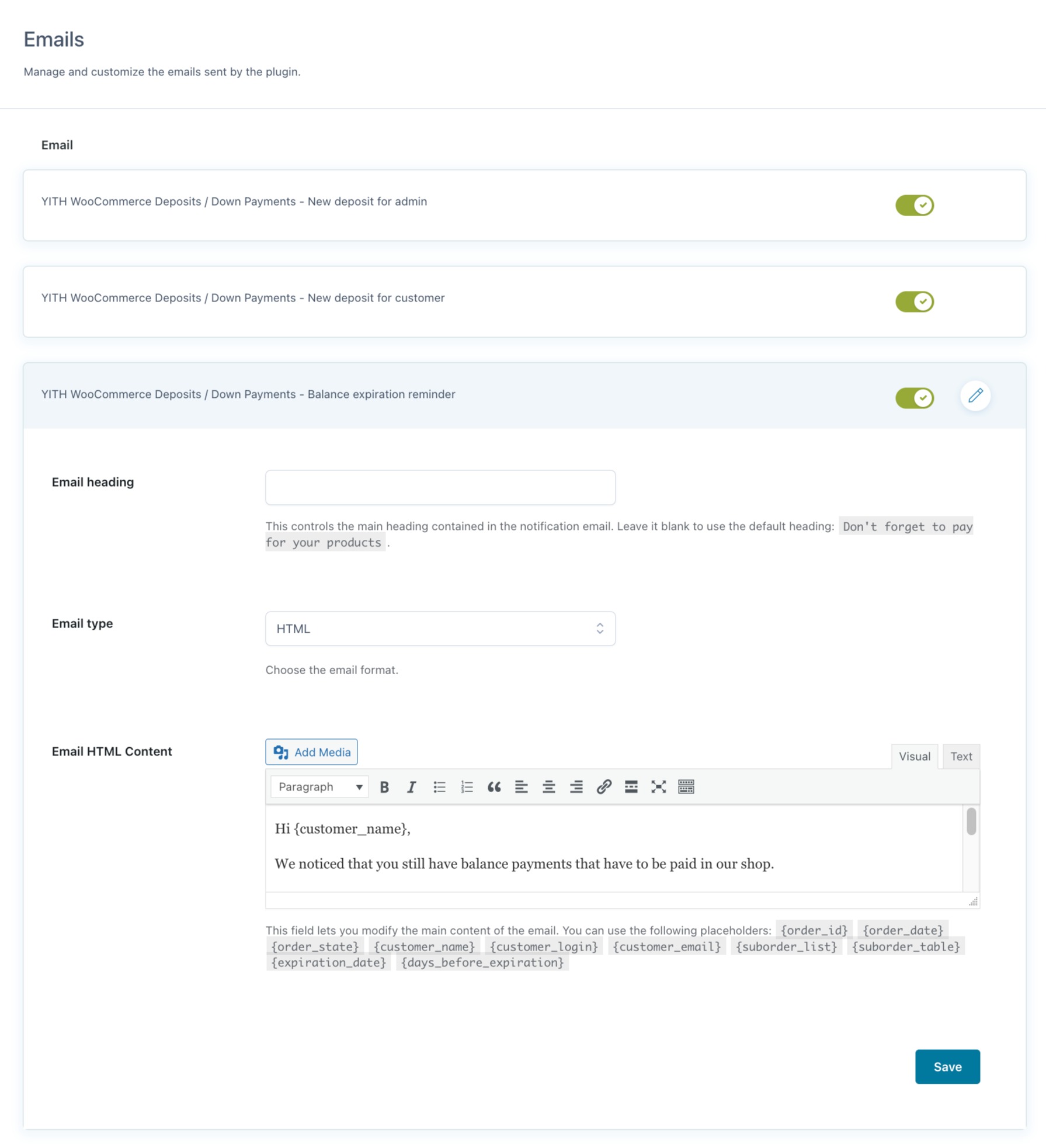 • take advantage of the integration with our YITH Booking and Appointment plugin to let customers pay for a deposit and pay for the remaining balance later on (e.g. a week before they check-in at the hotel, three hours before the medical appointment, etc.).