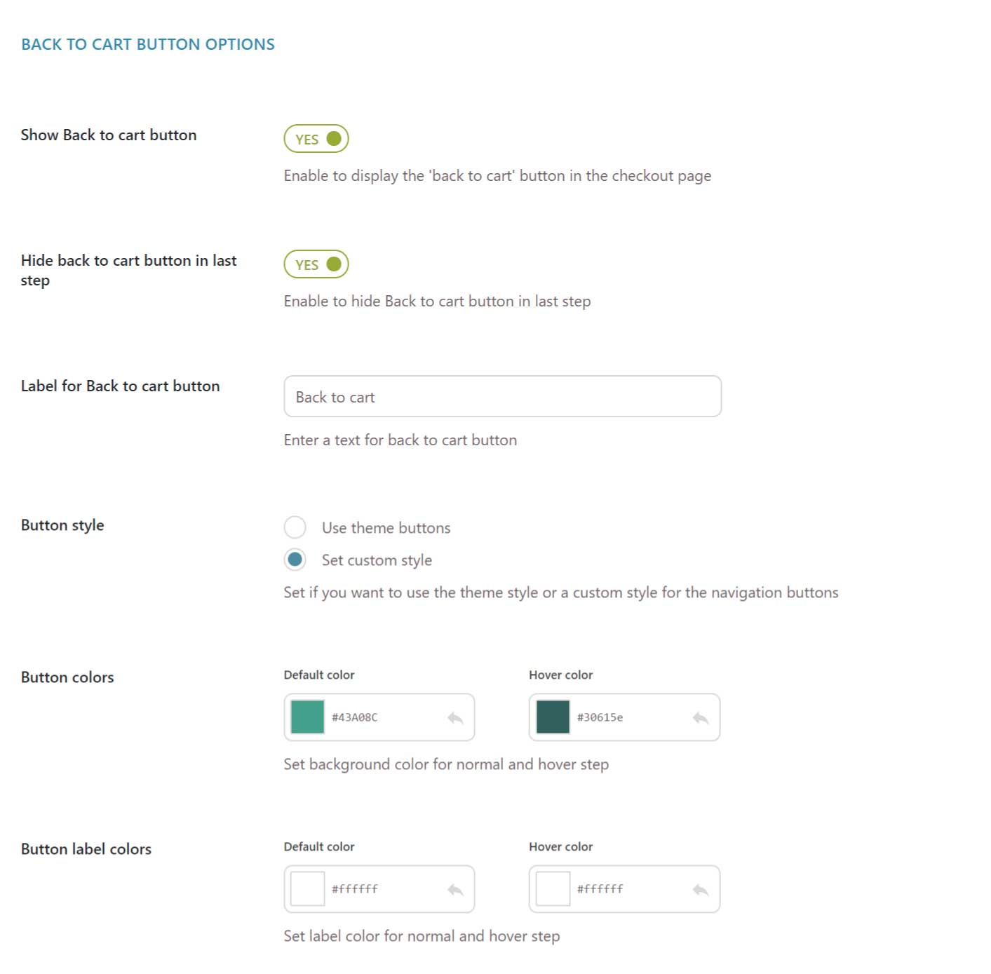 • Show or hide the “Back to cart” button and customize the style