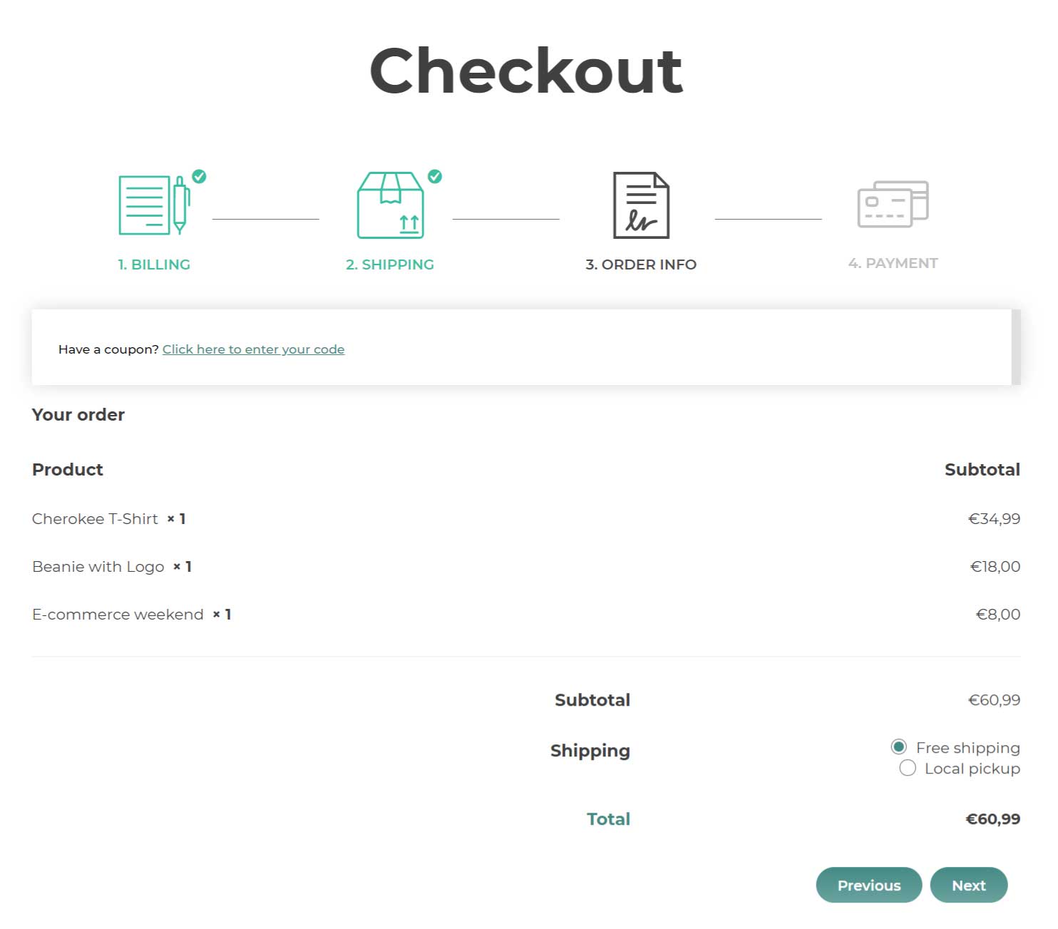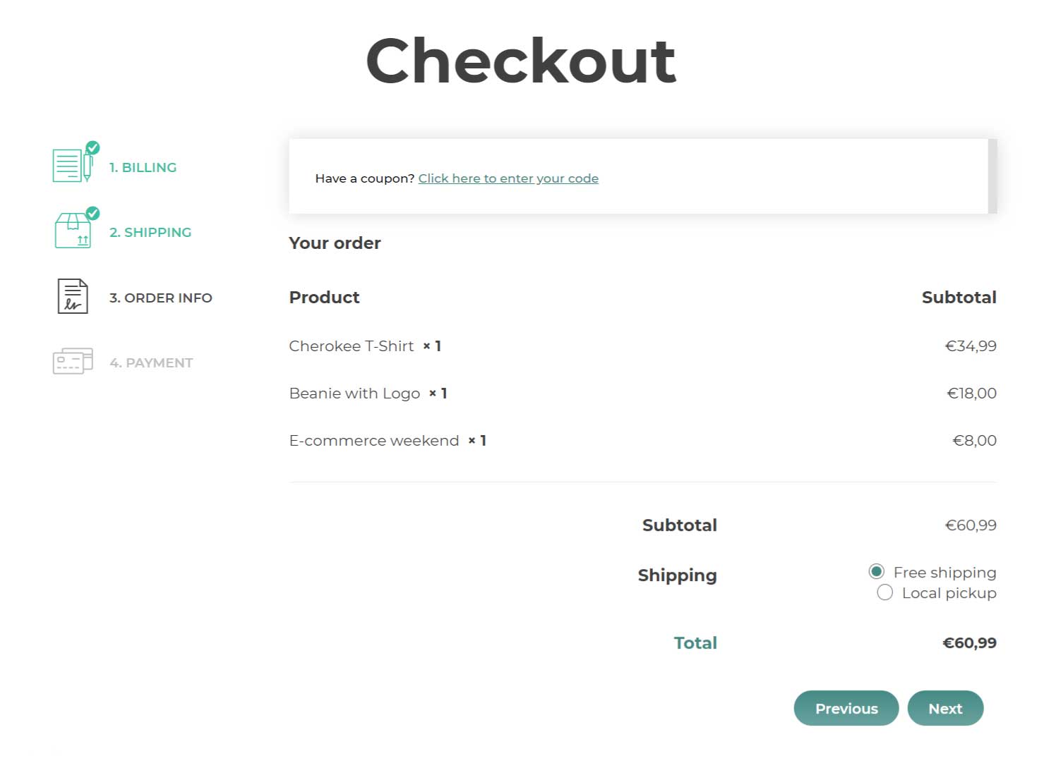 • You can reduce the number of steps and the cognitive effort required to the user by combining some steps of the checkout process into one (Billing & Shipping, Order info & Payment).
