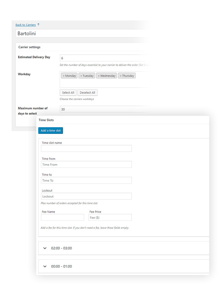 • Specify, for each workday, the available time slots for deliveries