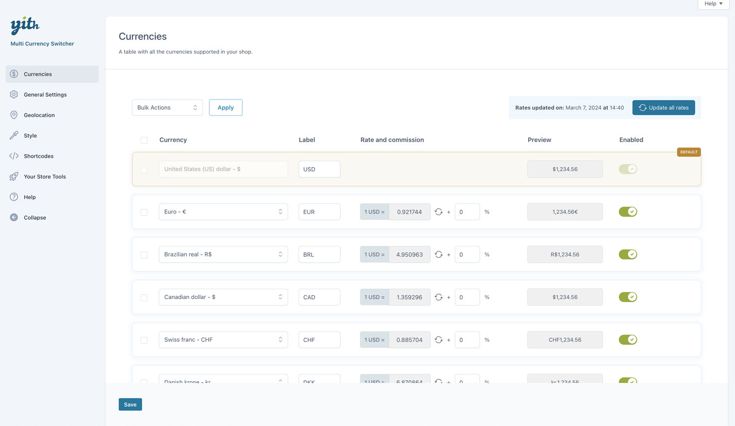 Choose whether to update the exchange rates once a month, once a week, every day, twice a day… it’s totally up to you. You can control how often the plugin will pull the updated rates from the provider to always show the right price in a totally automatic way.