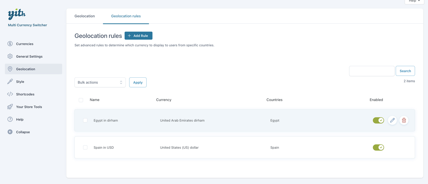 • Create custom rules to set which currencies need to be shown to users from specific countries;