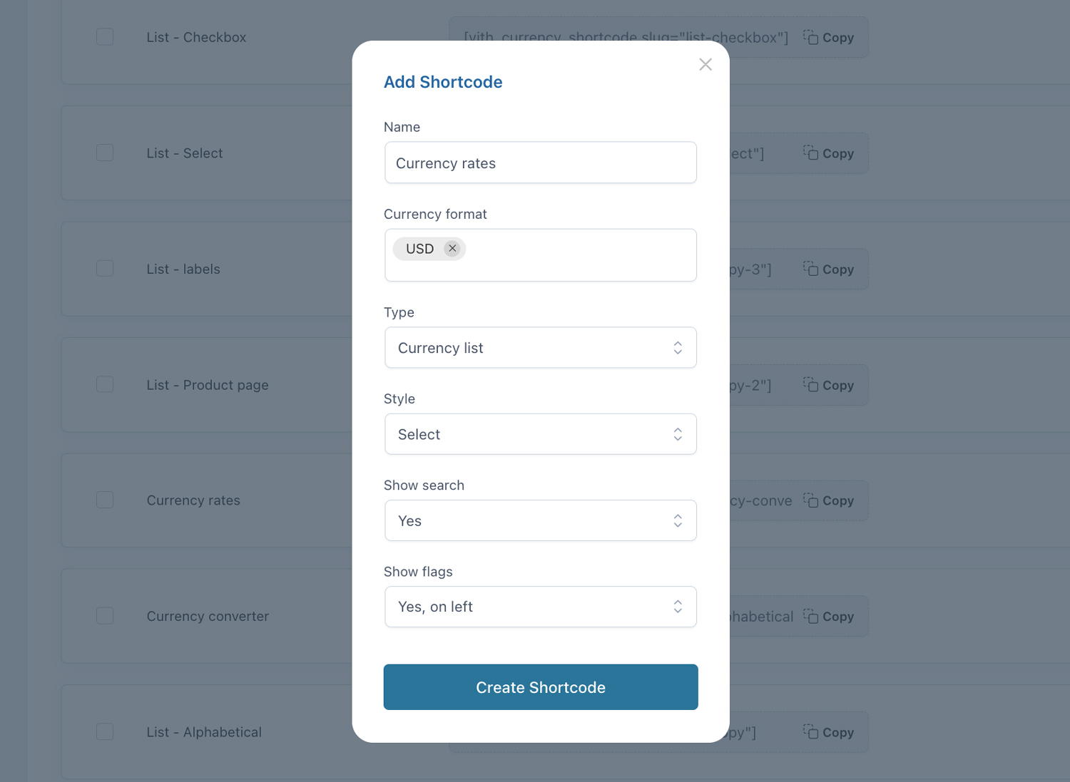Use shortcodes, widgets, and Gutenberg blocks to show a list of currencies and the switcher anywhere in your shop