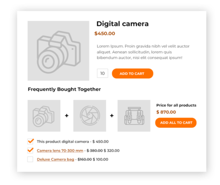 The Frequently bought together feature (used by some of the most popular e-commerce companies, such as Amazon) is designed to make your customers’ shopping experience easier and faster, and to structure an effective upselling strategy.
