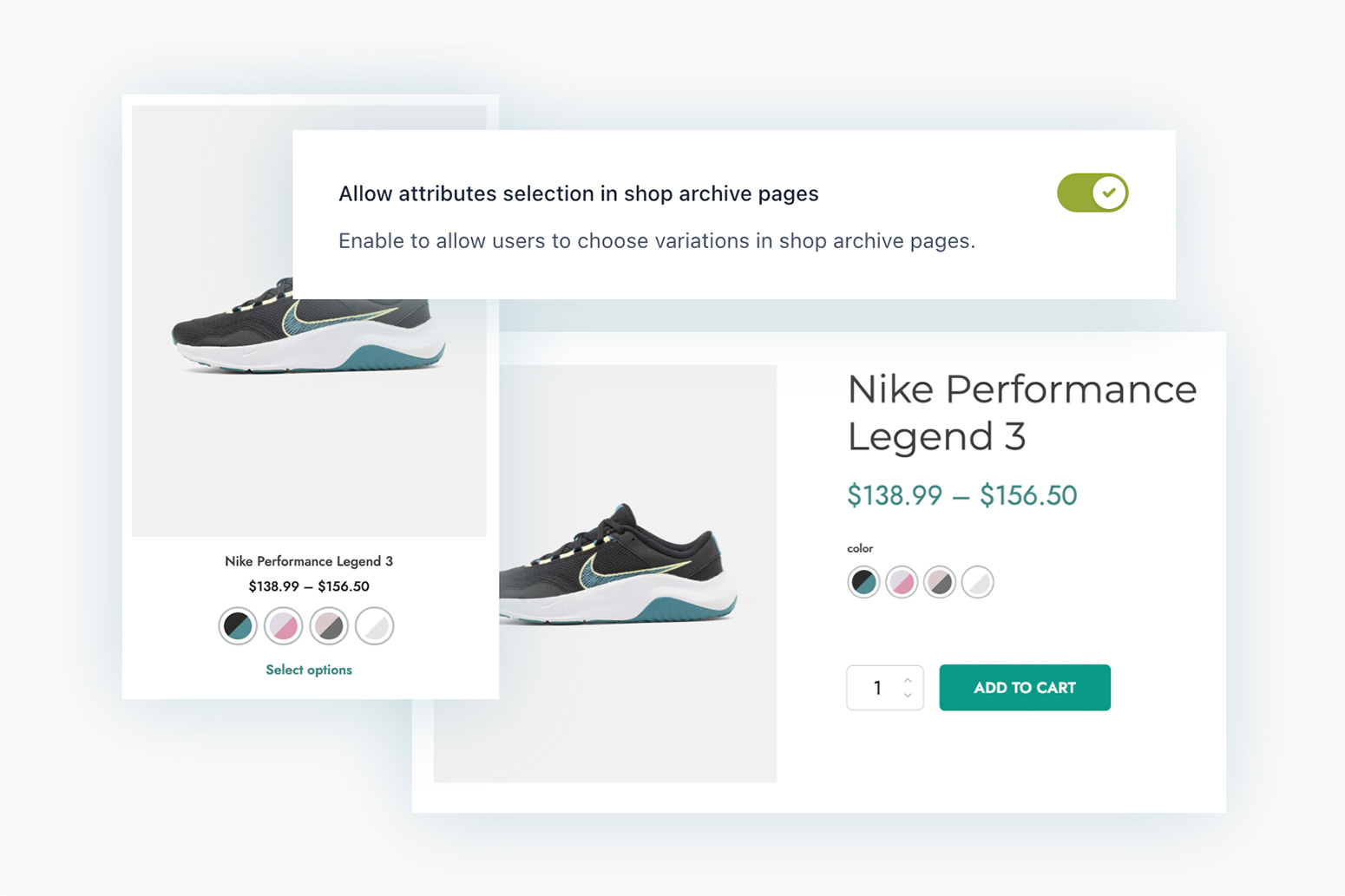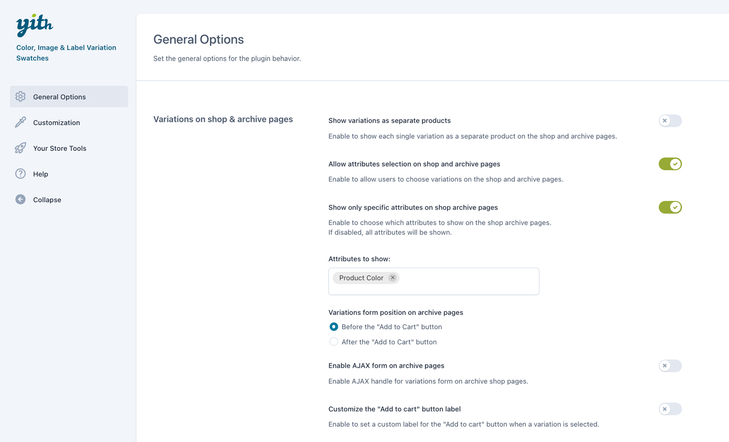 • choose whether to show product options also on the Shop page or make them available only on the product detail page;