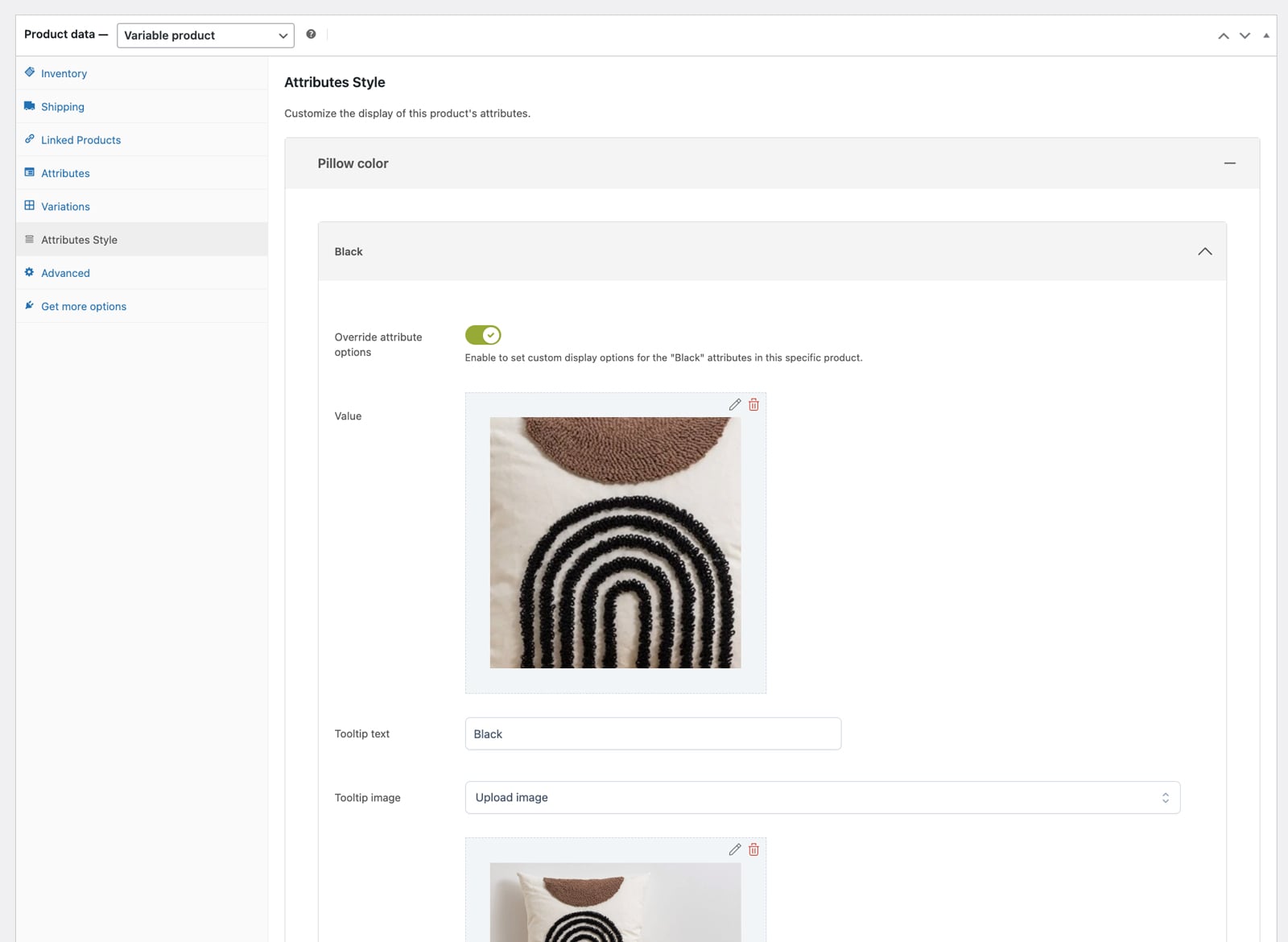 Choose whether to show a tooltip when hovering over the options to display the option name (e.g., the name of the color or style). In the tooltip, you can also choose whether to show a preview of the option: in this way, you can show, for example, a preview of the “blue” sweatshirt when the user hovers over the blue color sample.