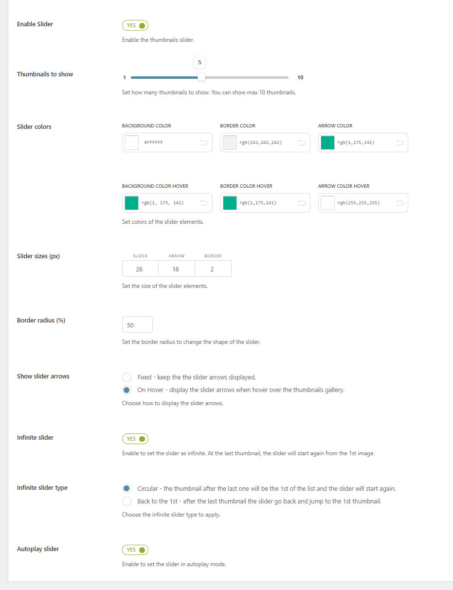 If you’ve got many images in the product gallery and want to skip the default WooCommerce feature that simply lists them in simple rows, one below the other, you can enable a slider instead and set the number of images to show on every slide. You can also enable the autoplay and set the slider to “infinite