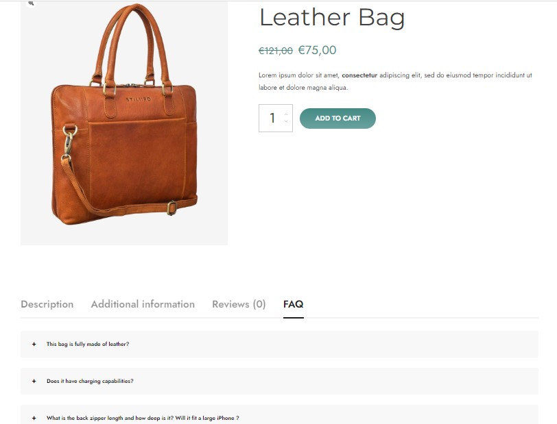 Since version 2.0, the plugin fully supports WooCommerce, so you will be able to configure specific FAQ sets on your product pages. On the product page, you will see an additional FAQ tab – listed among the default WooCommerce ones – where you can display the most frequently asked questions about your products to clear your customers’ pre-sales doubts in real time.