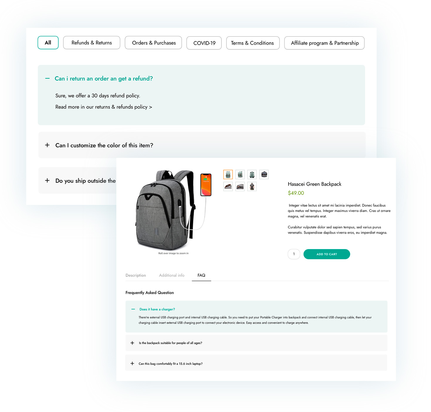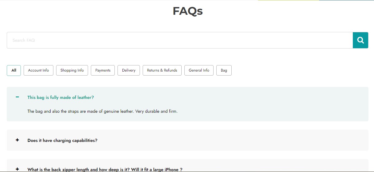 Do you have too many FAQs to display and want to make sure this page is user-friendly? Group your questions into categories (e.g. “Orders”, “Shipping”, “Returns & Refunds”, etc.) and let users filter the questions (in AJAX) based on the topic and category they are interested in.