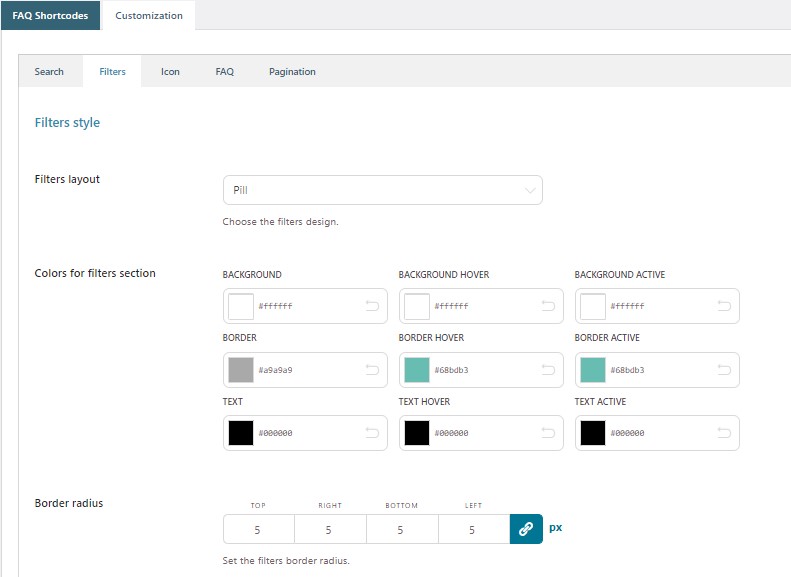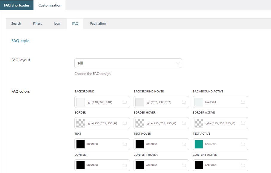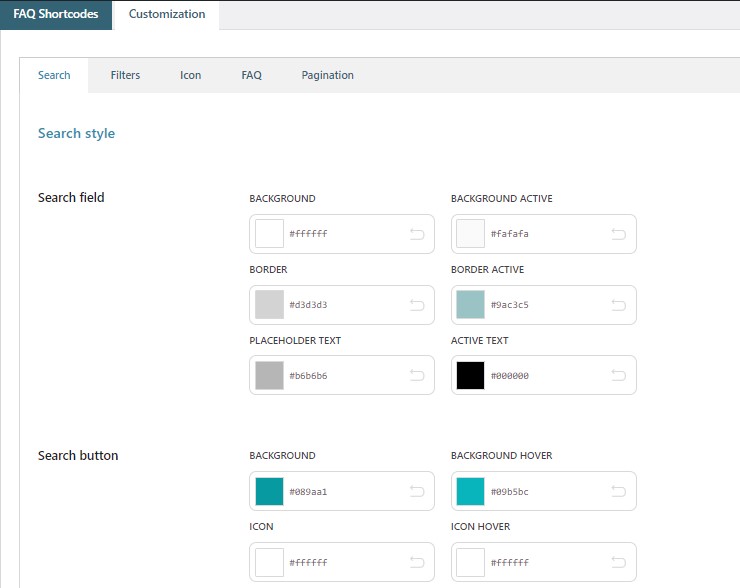 The plugin allows setting the colors of the search box, filters, icon, FAQ, and pagination whereas the font will be the same as the theme you use.