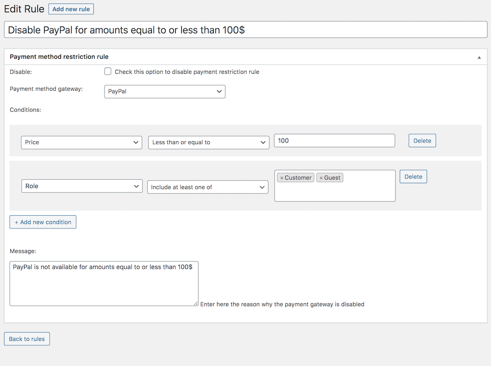 Just what I needed!I just got it and wanted to come here and say it's perfect to create all sorts of restrictions. I've already restricted PayPal and COD in specific countries and now I'm creating rules for specific users