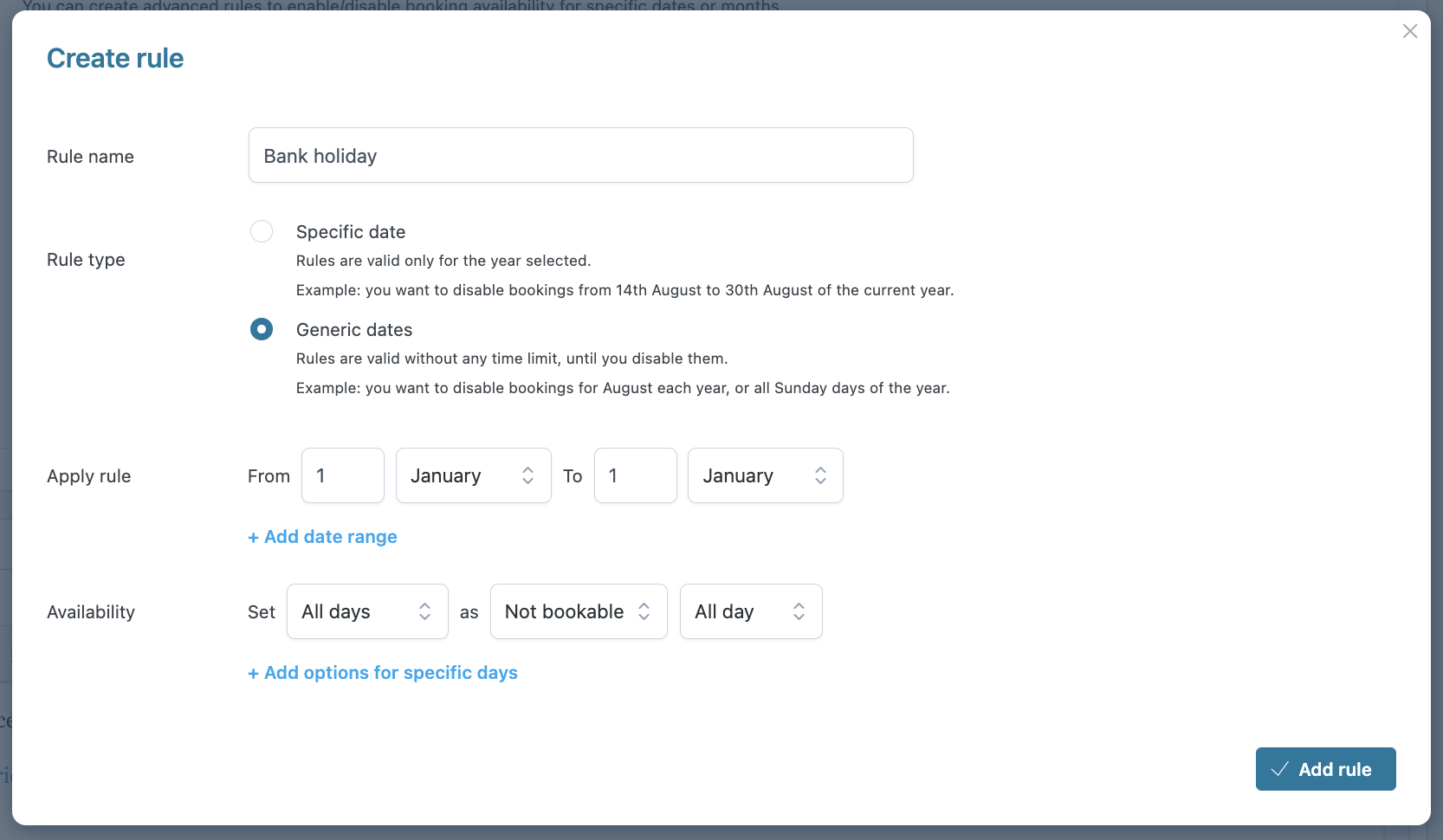 You can configure a booking product without any limitations or enable/disable specific days or times. Do you give cooking lessons only on Tuesday and Thursday from 5 pm to 8 pm and do you want your users to be able to book only these days and time slots? You can do it! Do you want to make the sea view apartment unavailable in August because you want to use it yourself? Or not accept bookings and appointments for two weeks so you can go on vacation? With availability rules, you can manage any scenario.