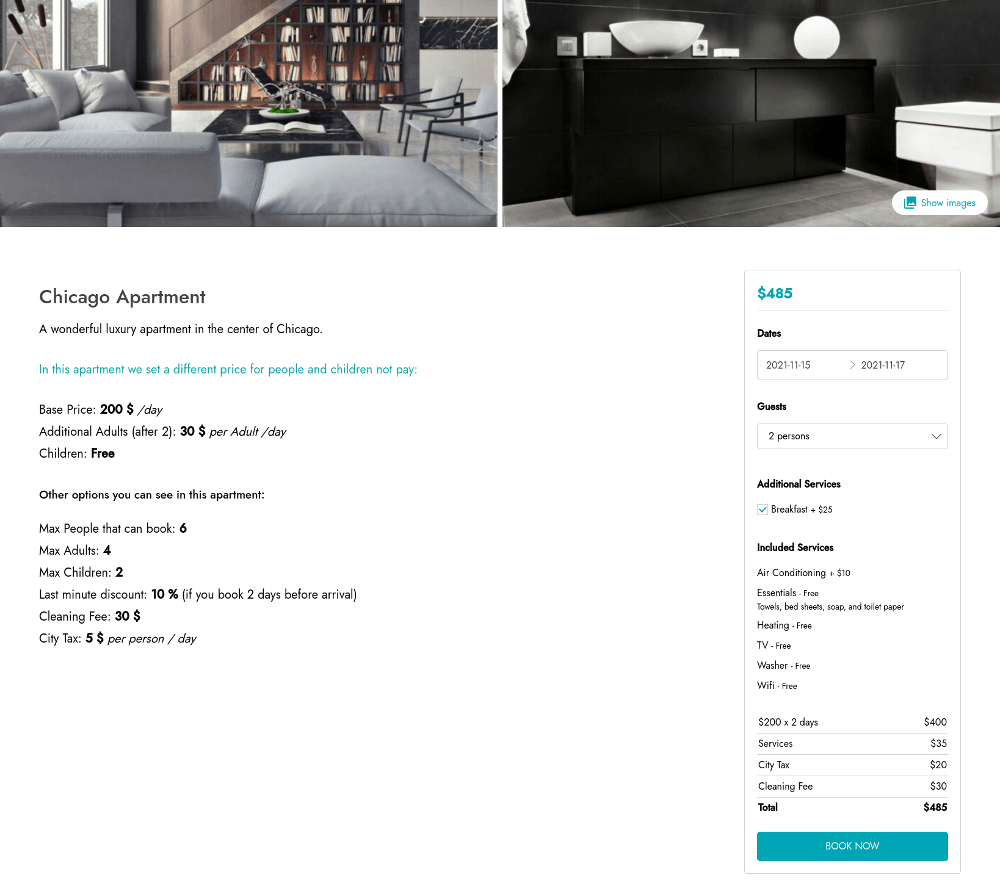 For each Booking product, you can choose the price that users will have to pay per hour/day/month. You can set a fixed price (e.g. €100 for an apartment) or multiply the cost per person (e.g. €100 for each person staying in the apartment). You can offer last-minute discounts and add unlimited custom prices (cleaning fee, tax, commissions, additional services, etc.).