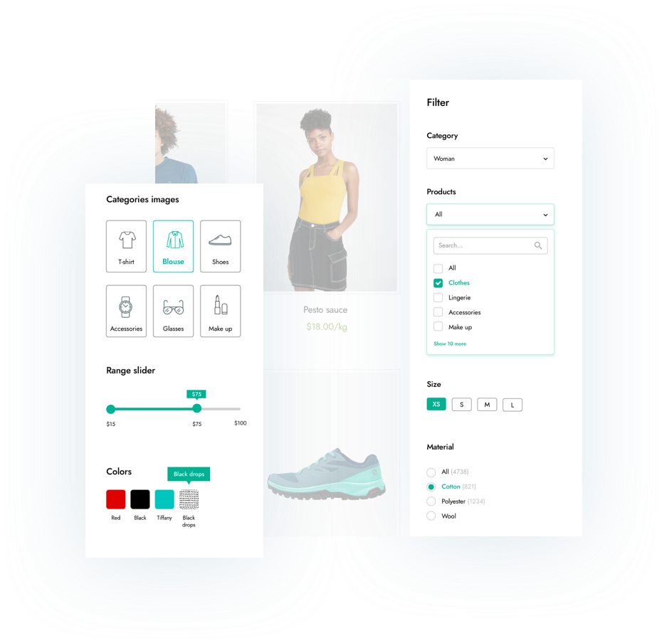 Ayuda a tus clientes a encontrar fácilmente los productos filtrando por precio, talla, colores y otros valores personalizados.