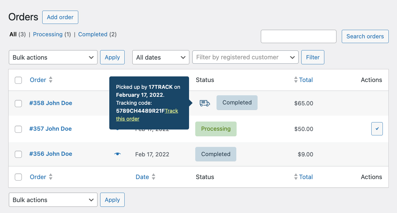• aggiungi, modifica o importa il numero di tracciamento della spedizione, il nome del corriere e l’URL di tracciamento per ogni ordine effettuato nel tuo e-commerce;