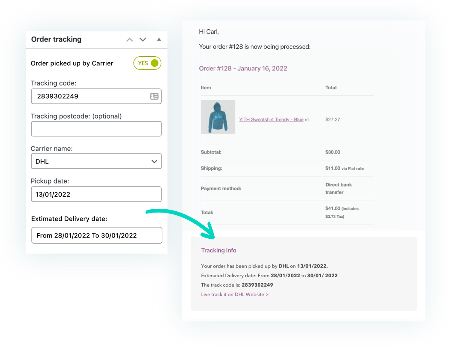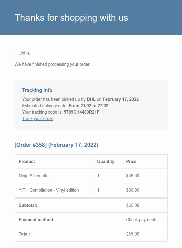 Integrando questi due plugin puoi usare i segnaposto disponibili per mostrare i dati di tracciamento dell’ordine nelle email di YITH Custom Order Status.