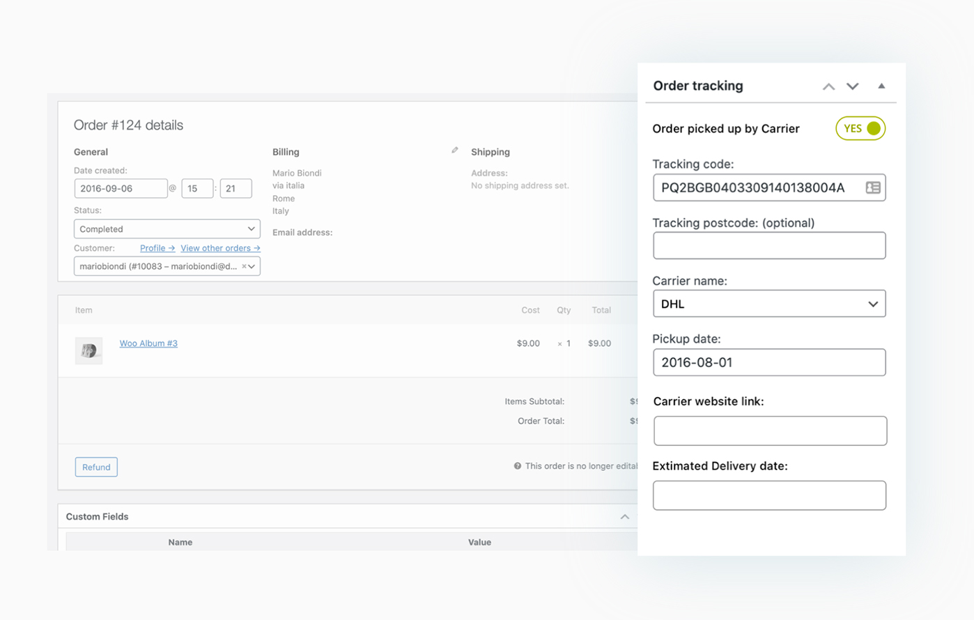 Il plugin è estremamente semplice da utilizzare. Una volta installato devi solo aprire l’ordine e inserire nell’apposito pannello i dati di tracciamento dello stesso. Puoi anche importare i dati di tracciamento utilizzando un file CSV.
