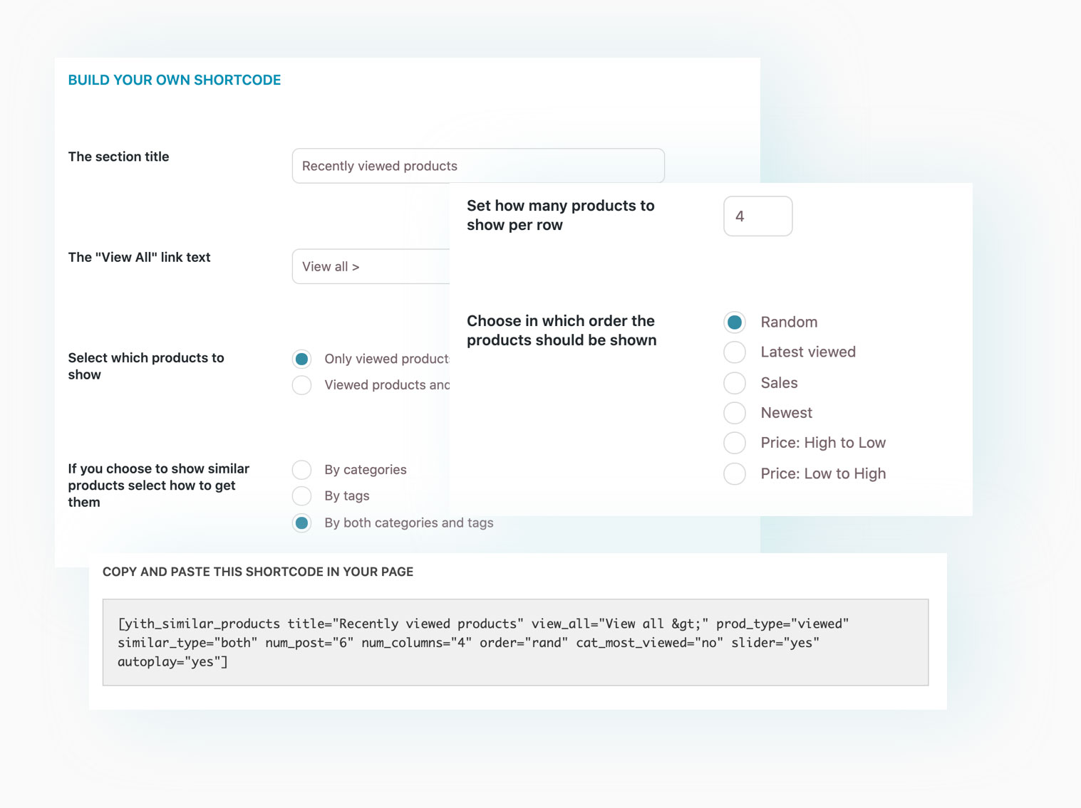 Scegli se mostrare solo i prodotti visualizzati dall’utente o anche prodotti correlati (stesso tag o categoria), definisci quanti prodotti mostrare e in quale ordine, attiva o meno lo slider: configura il plugin a tuo piacimento per generare infiniti shortcode personalizzati. Dovrai solo copiarli e incollarli dove preferisci. Veloce e facile.