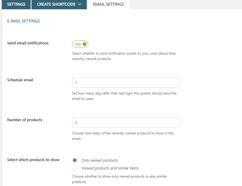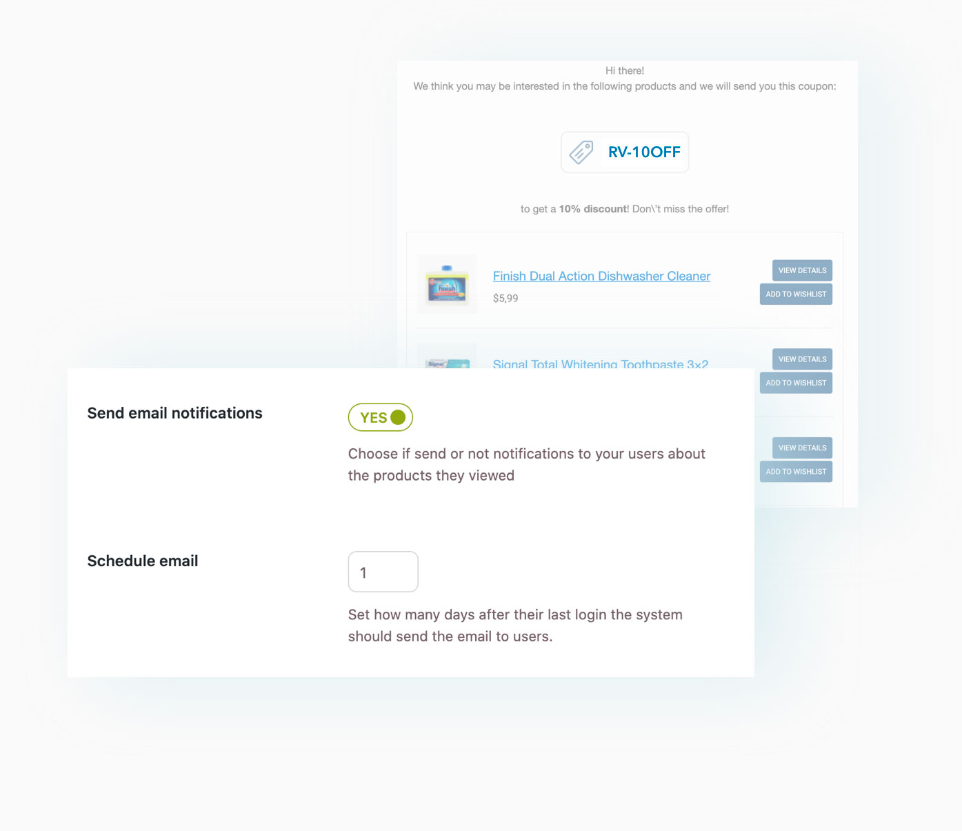 Imposta un’email automatica da inviare dopo un determinato numero di giorni a tua scelta per ricordare ai tuoi utenti dei prodotti che hanno visualizzato nel tuo store. Attivando questa opzione, il plugin penserà a tutto inviando l’email in base alle tue impostazioni per invitare gli utenti ad acquistare i prodotti a cui sono interessati.