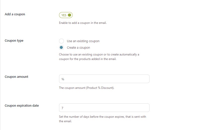 Usa l’editor del plugin per personalizzare il messaggio dell’email automatica: aggiungi un testo convincente e allega un codice sconto personalizzato per incoraggiare i tuoi utenti ad acquistare gli articoli a cui sono interessati: un bonus che non vorranno di certo perdere!