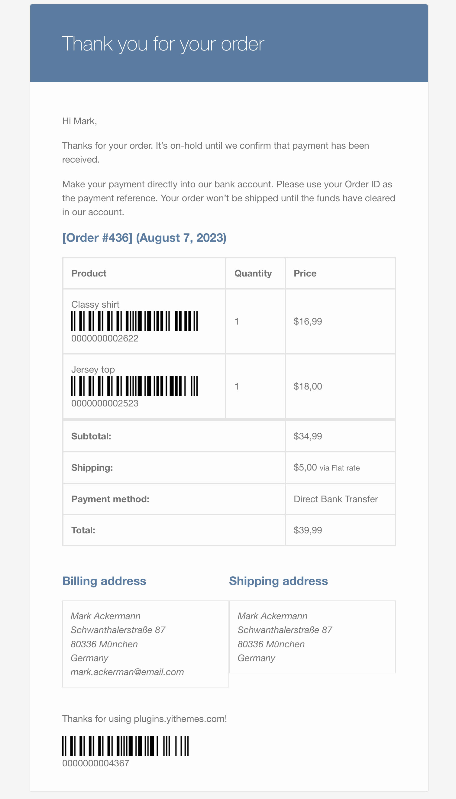 Il plugin ha l’opzione per mostrare il codice a barre dell’ordine in tutte le email o solo in quelle per gli ordini completati.