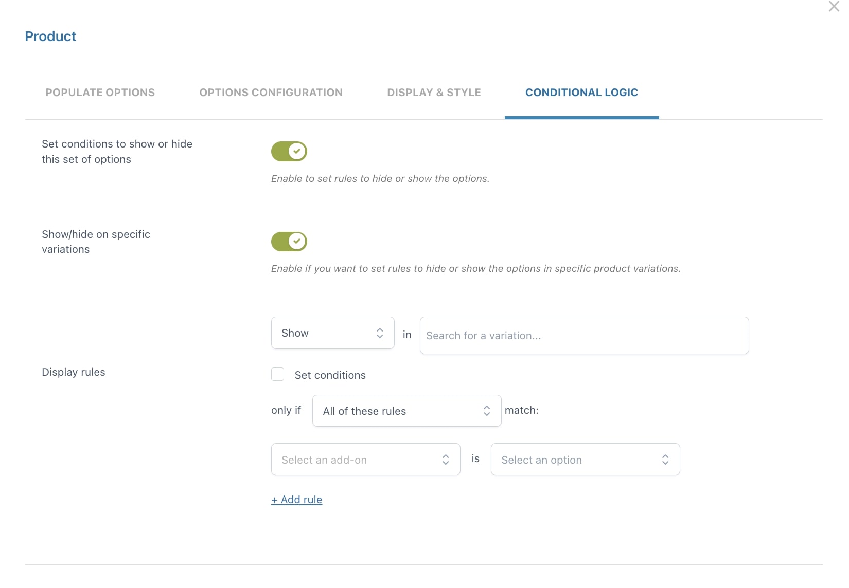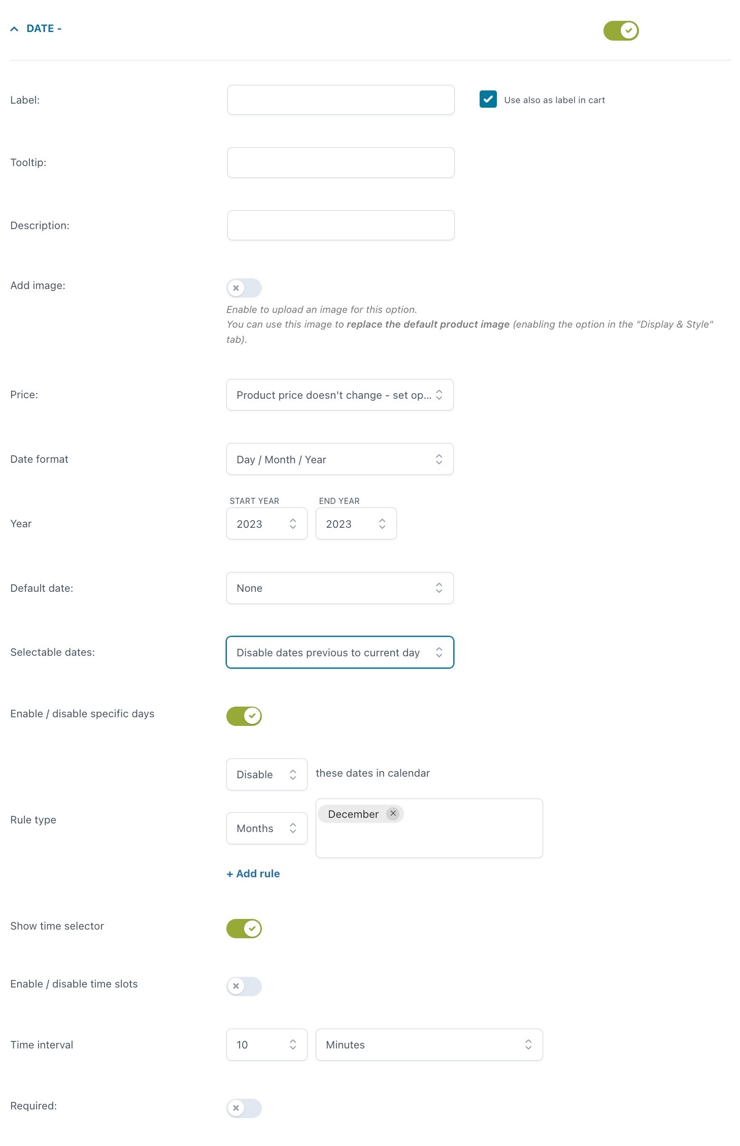 Le regole di dipendenza rendono il plugin ancora più potente e ti permettono di mostrare o nascondere alcune opzioni in base a cosa seleziona l’utente. Alcuni esempi: nascondi il selettore di data e orario se l’utente non abilita l’opzione relativa alla consegna a domicilio; mostra il campo upload solo se l’utente seleziona l’opzione per ottenere la personalizzazione del prodotto, ecc.