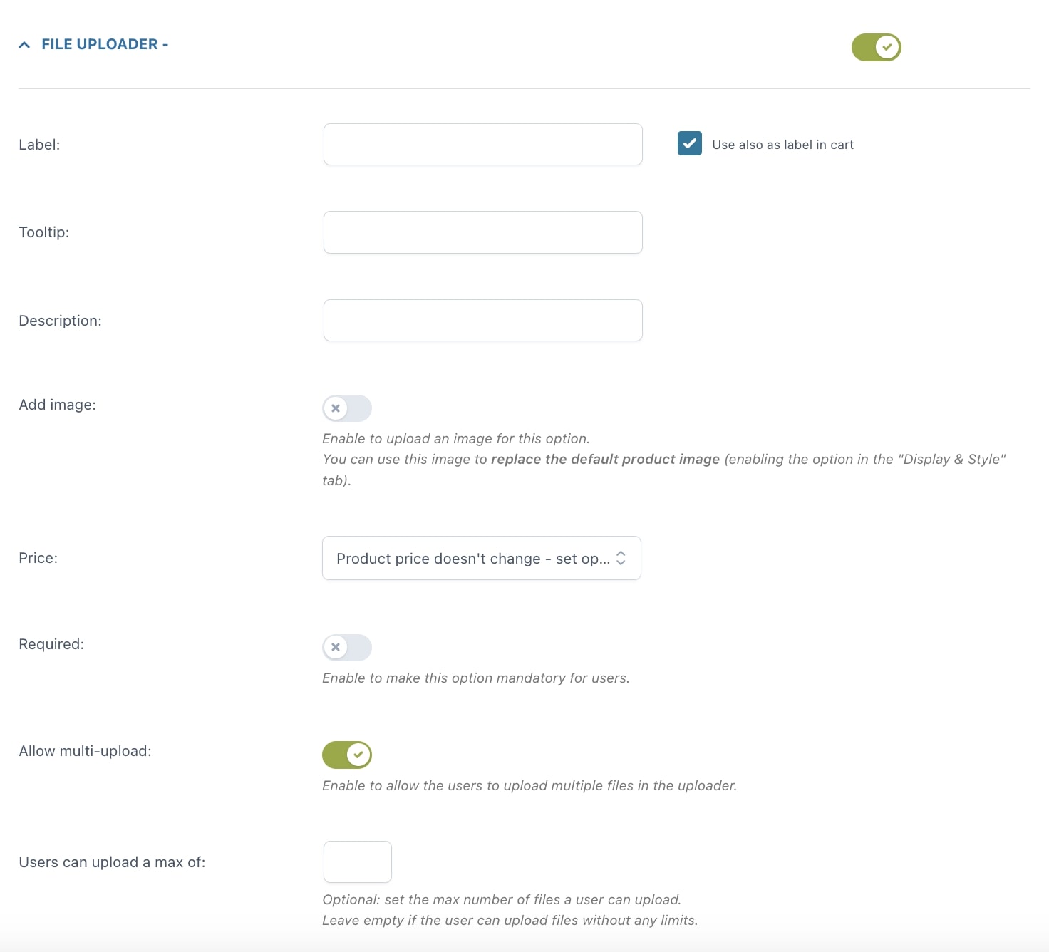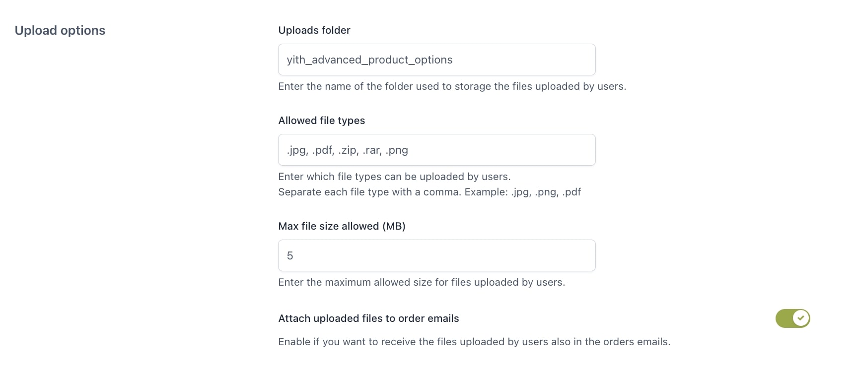 Se utilizzi campi per permettere all’utente di caricare file (documenti, immagini, file grafici, ecc) utilizza le opzioni integrate nel plugin per definire i permessi relativi alle tipologie di file consentite, al peso massimo dei file caricati e, per migliorare la gestione ed evitare errori, attiva l’opzione per ricevere i file caricati dai clienti come allegati alle email relative ai loro ordini e imposta in quale cartella verranno caricati automaticamente tutti i file caricati dagli utenti.