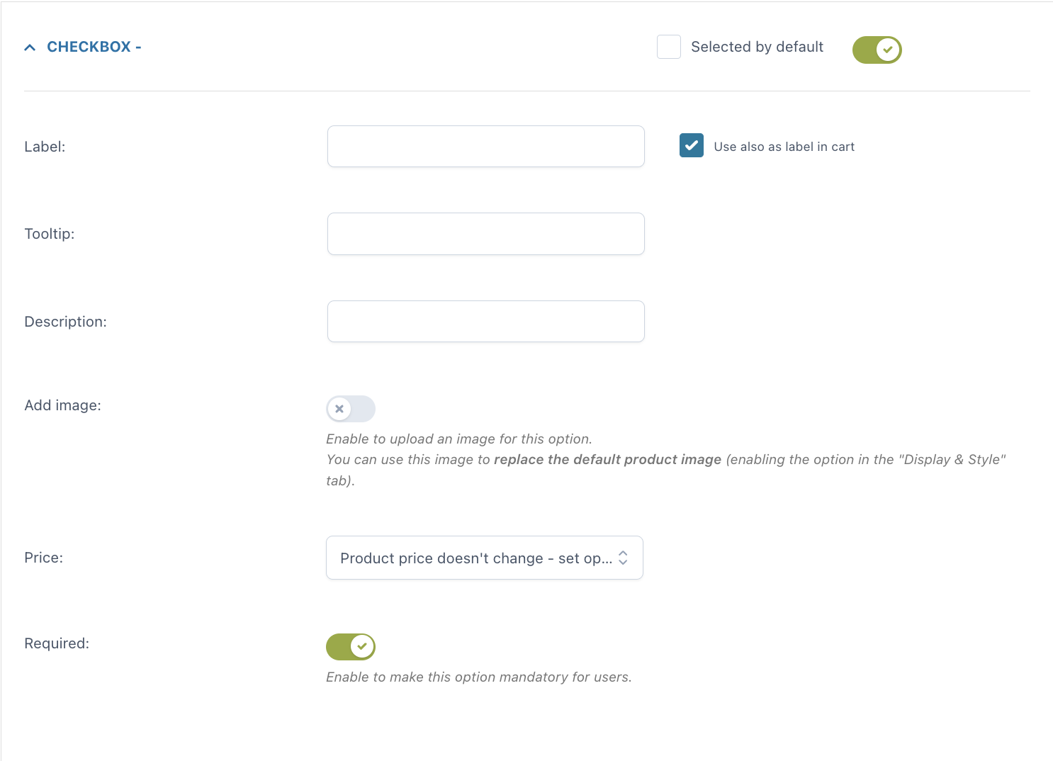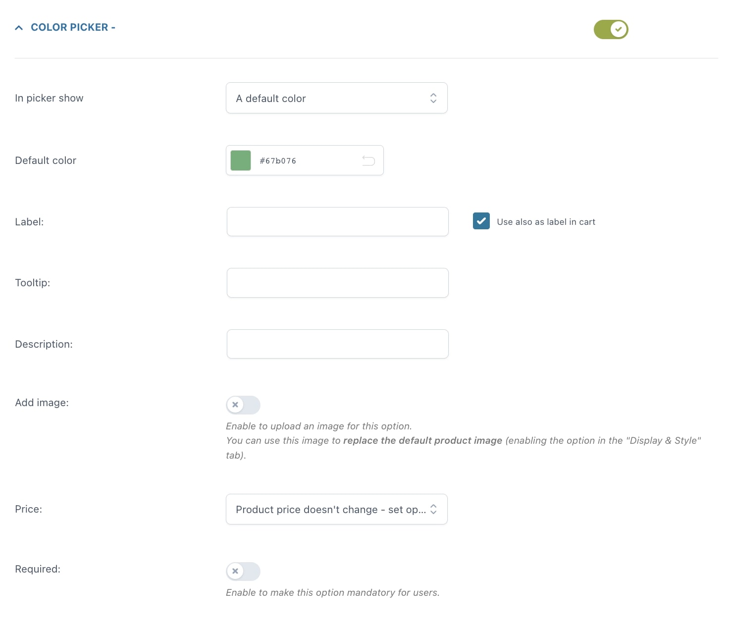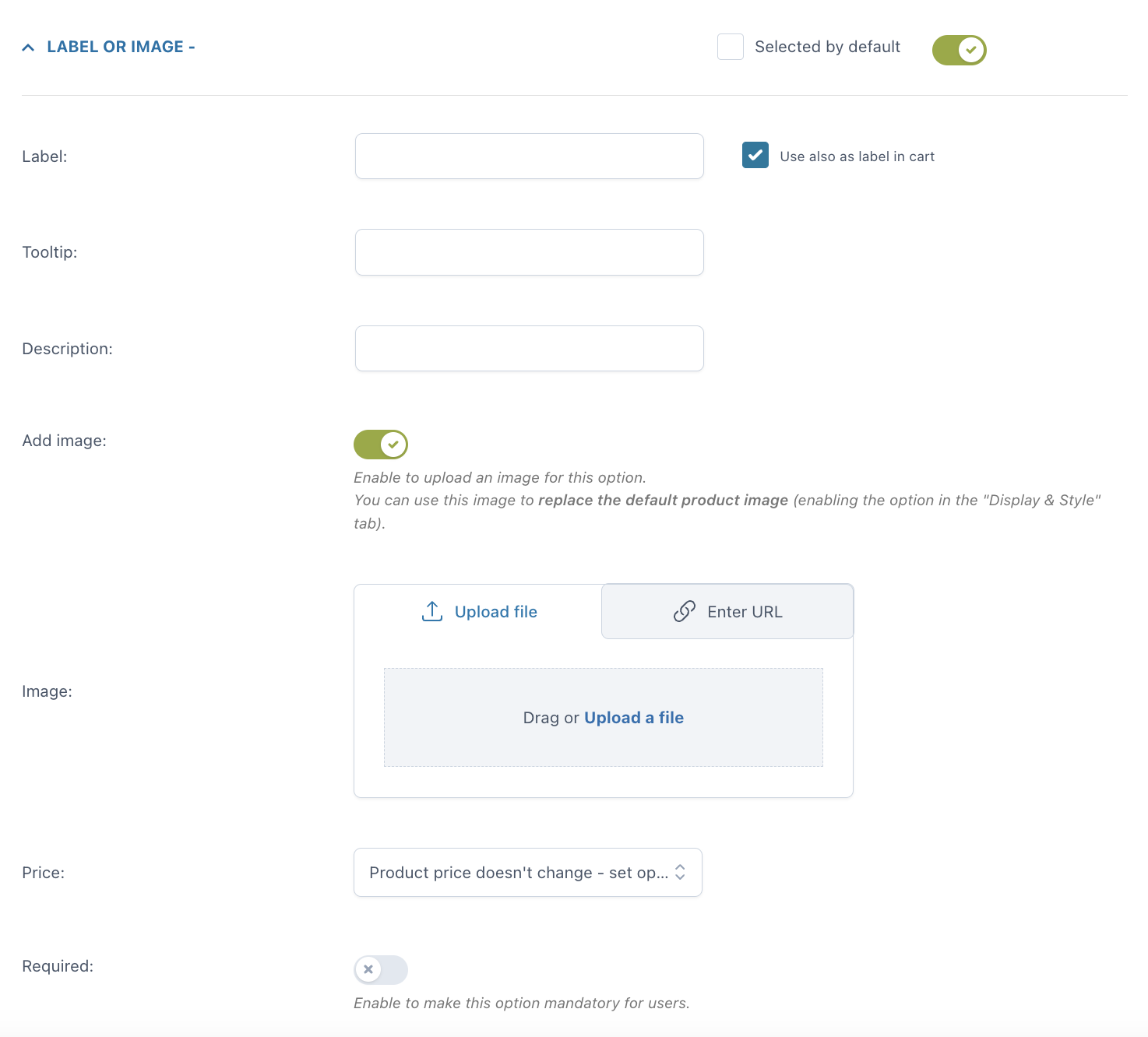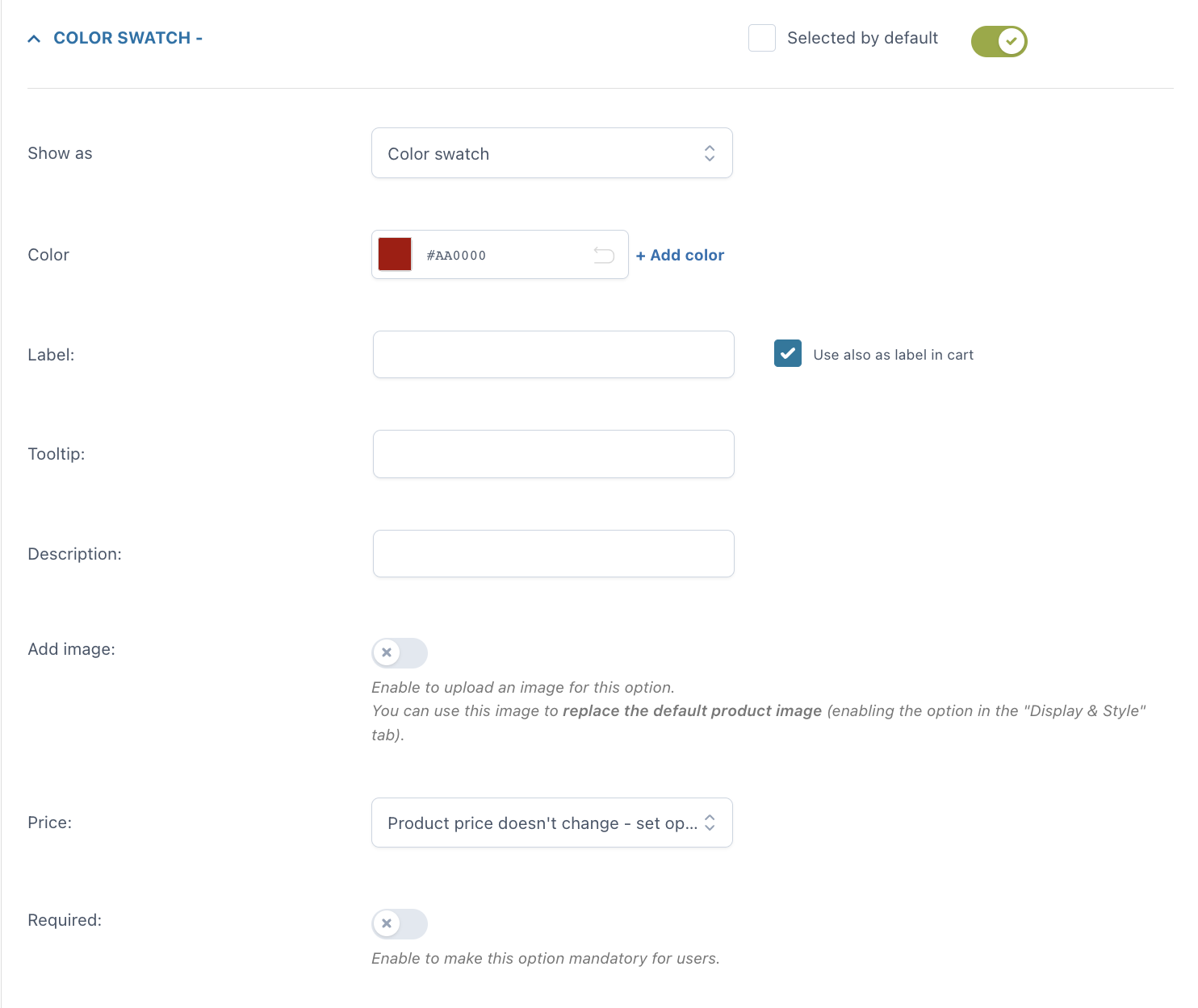 Una volta inserita l’opzione, puoi personalizzare come apparirà nella pagina prodotto: quale titolo e/o descrizione mostrare, se aggiungere o meno un tooltip e un’immagine per identificare l’opzione (puoi anche scegliere se questa immagine sostituirà l’immagine predefinita del prodotto quando l’opzione viene selezionata dall’utente). Puoi inoltre impostare l’opzione come obbligatoria e scegliere se mostrarla selezionata di default nella pagina.