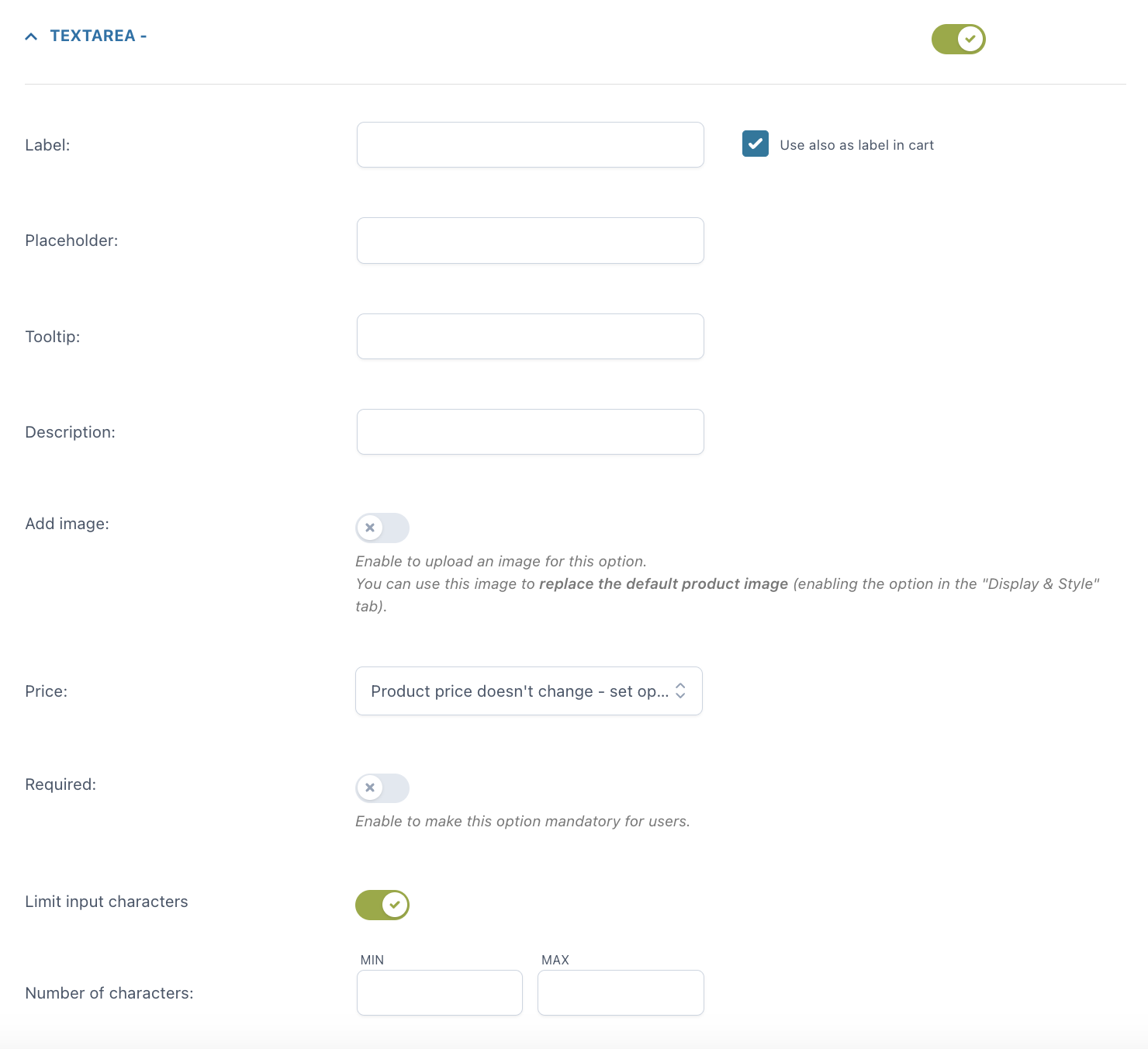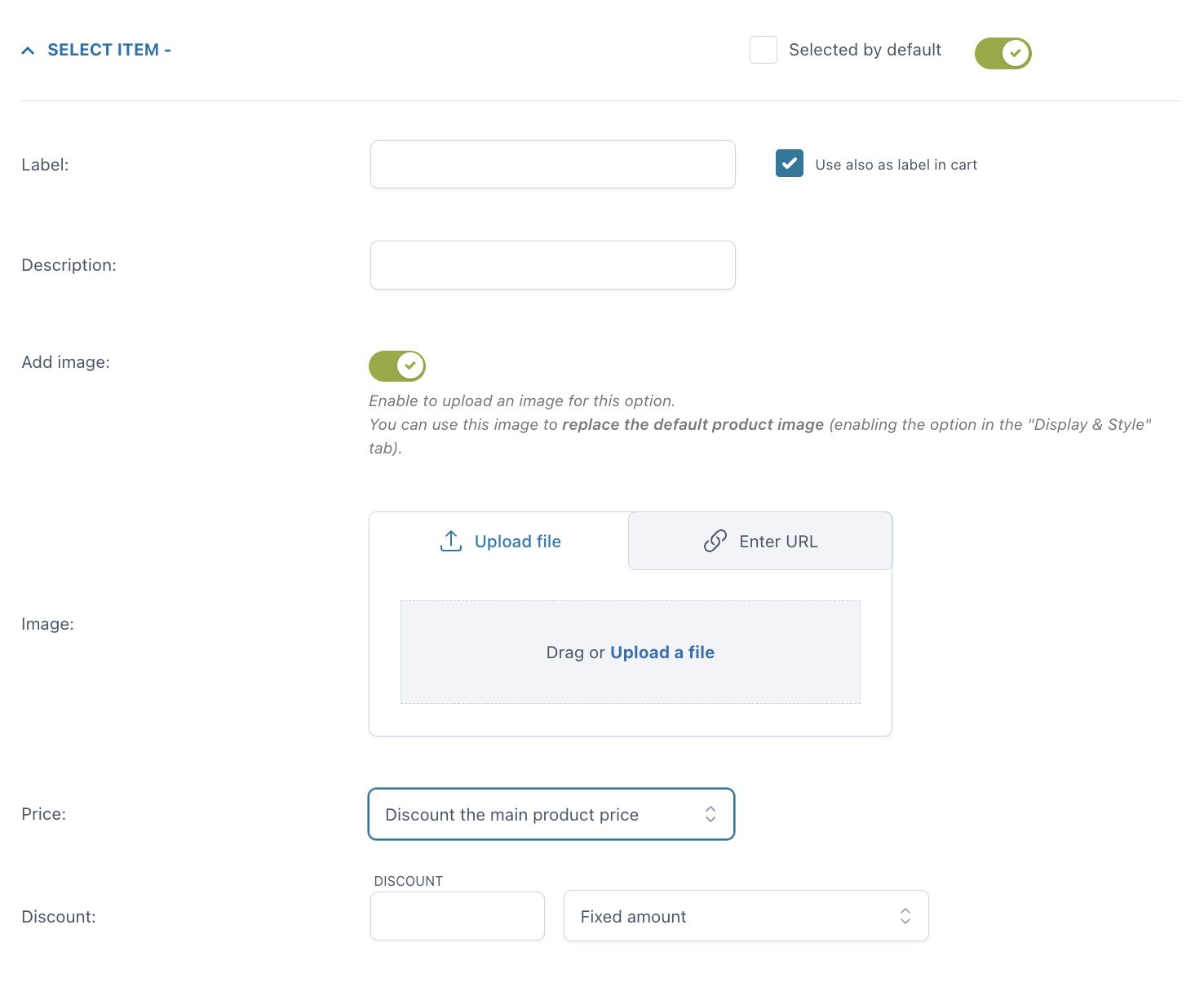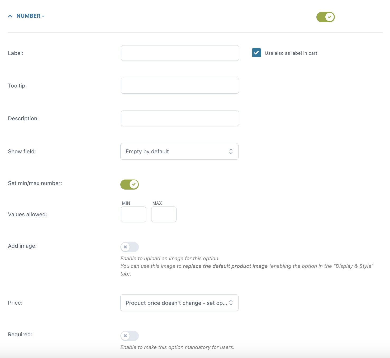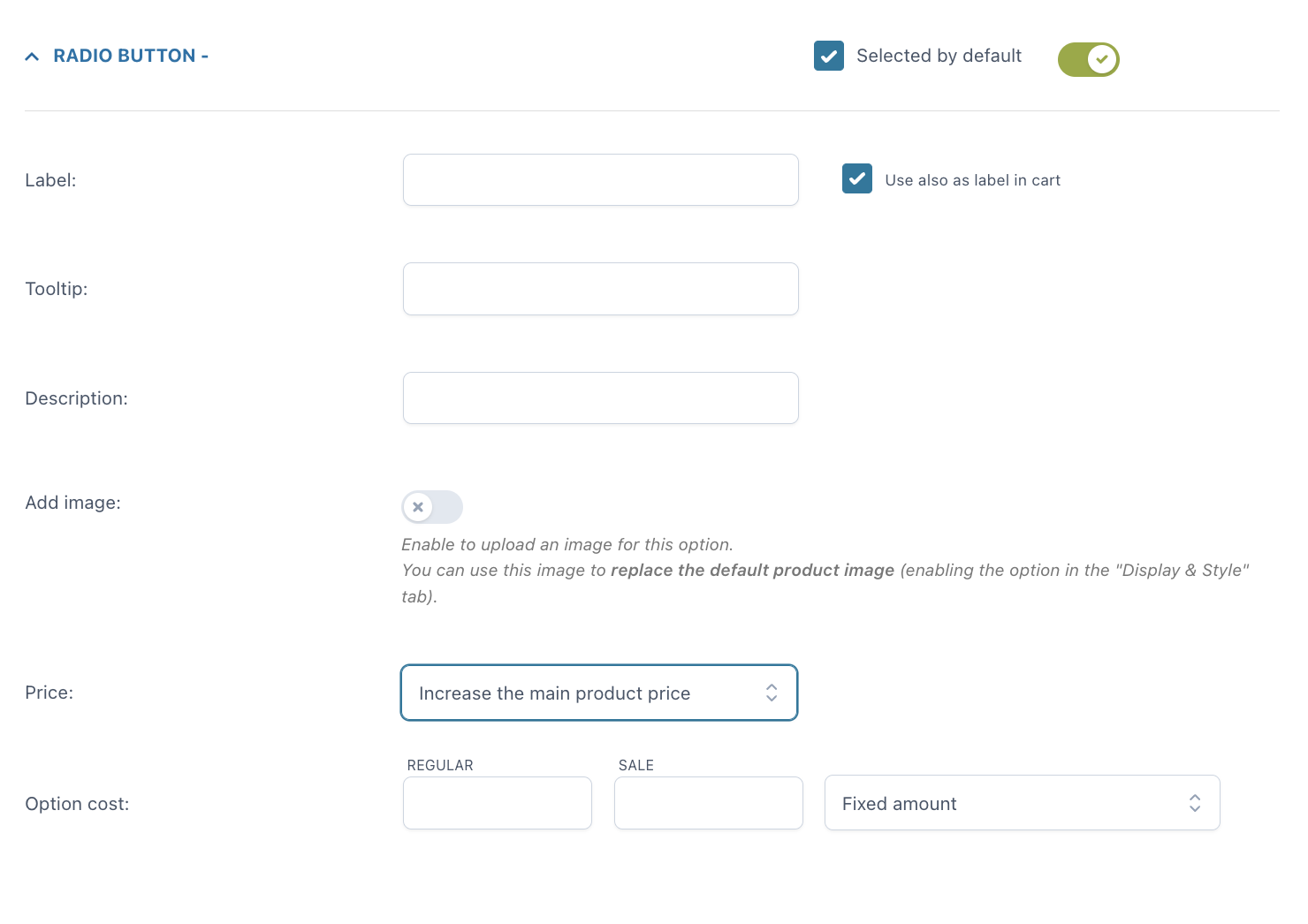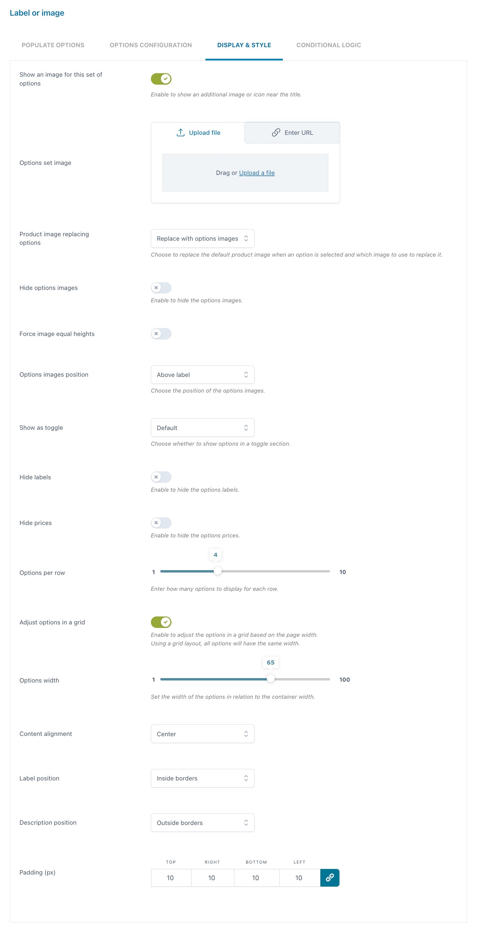 Una volta inserita l’opzione, puoi personalizzare come apparirà nella pagina prodotto: quale titolo e/o descrizione mostrare, se aggiungere o meno un tooltip e un’immagine per identificare l’opzione (puoi anche scegliere se questa immagine sostituirà l’immagine predefinita del prodotto quando l’opzione viene selezionata dall’utente). Puoi inoltre impostare l’opzione come obbligatoria e scegliere se mostrarla selezionata di default nella pagina.