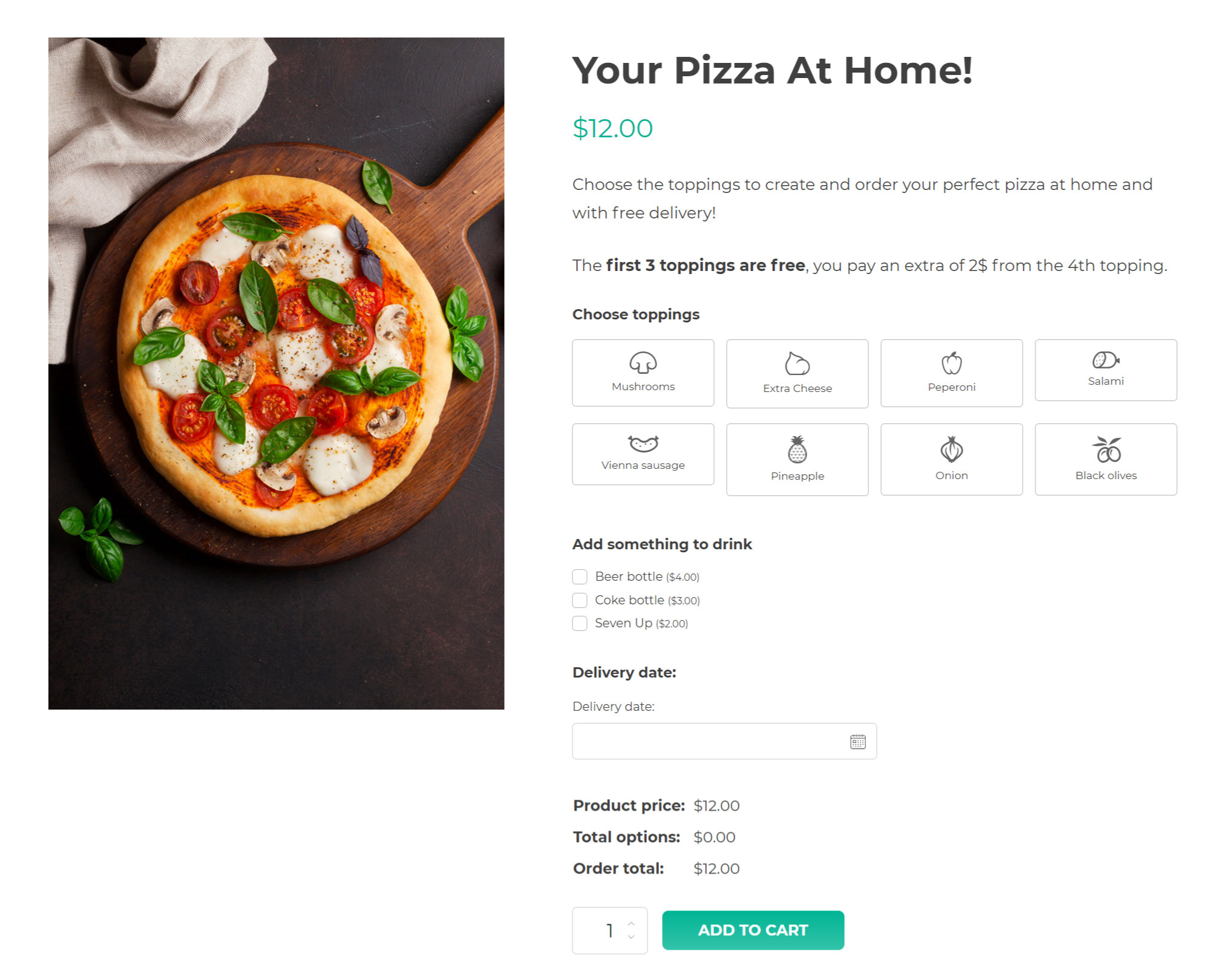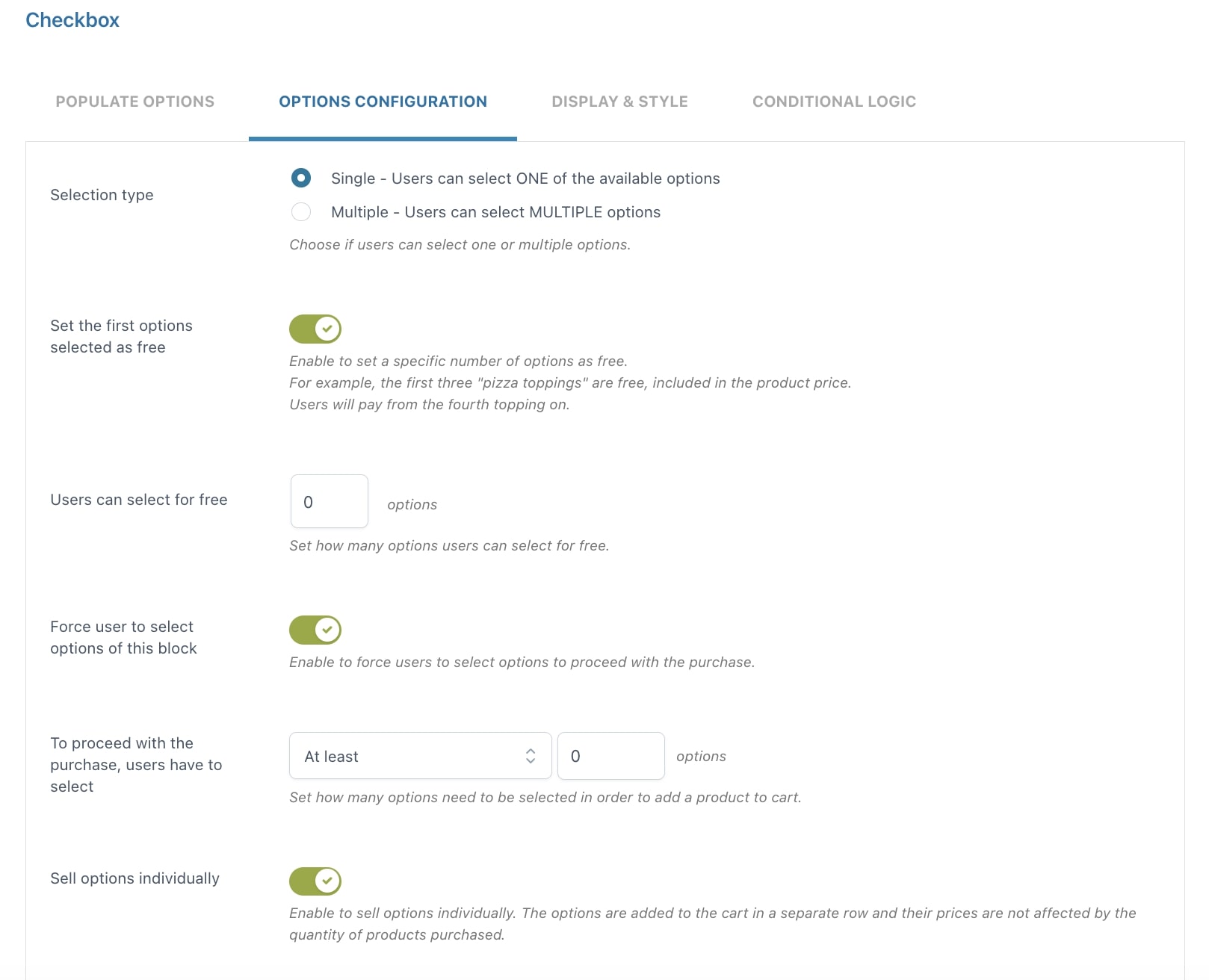 Imposta delle regole che vincolano il numero minimo o massimo di opzioni da selezionare affinché l’utente possa procedere all’acquisto del prodotto. Per esempio, scegli gli ingredienti per la tua pizza: dovranno essere almeno due ma non più di sei. Solo allora il prodotto potrà essere aggiunto al carrello.