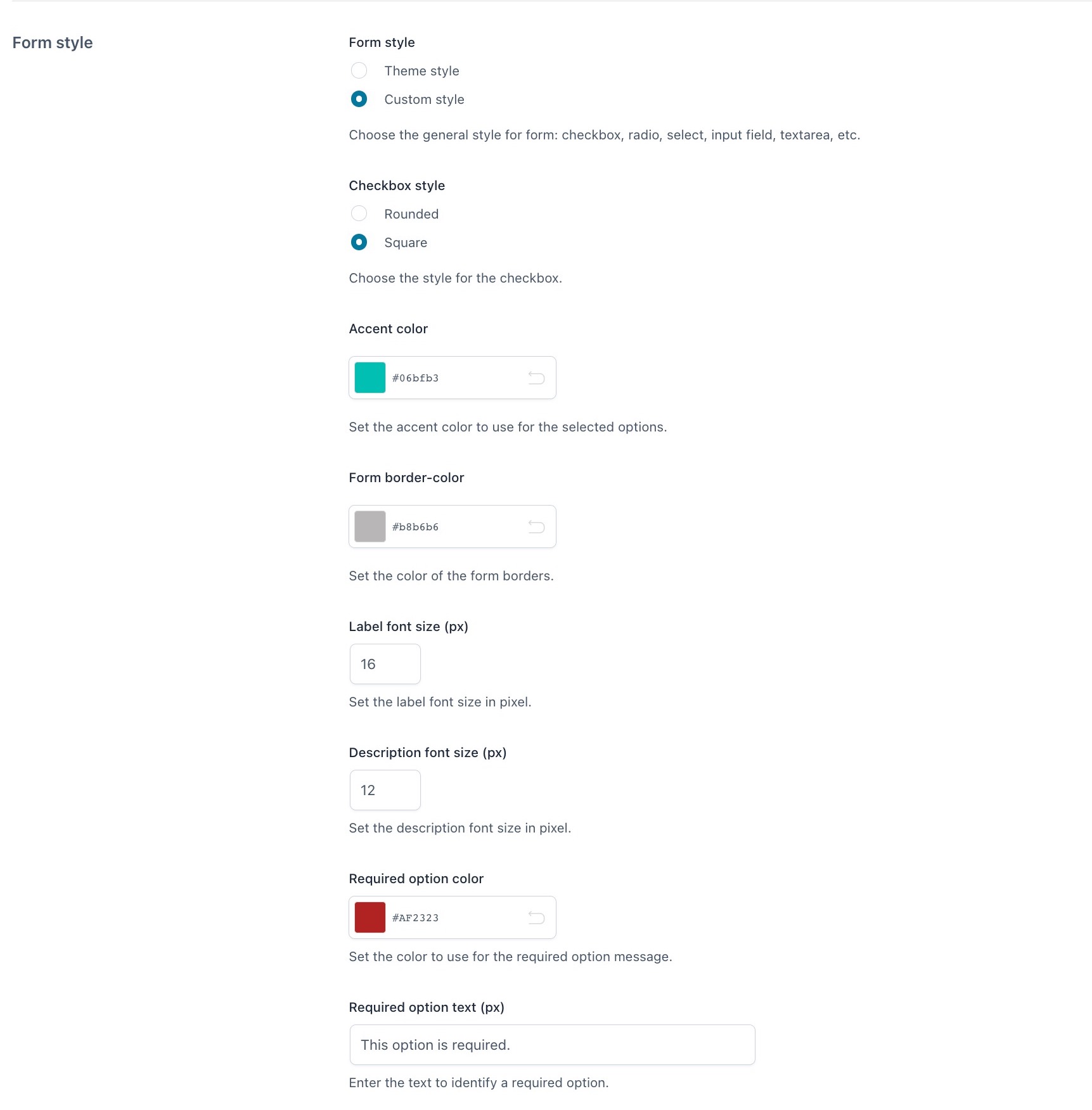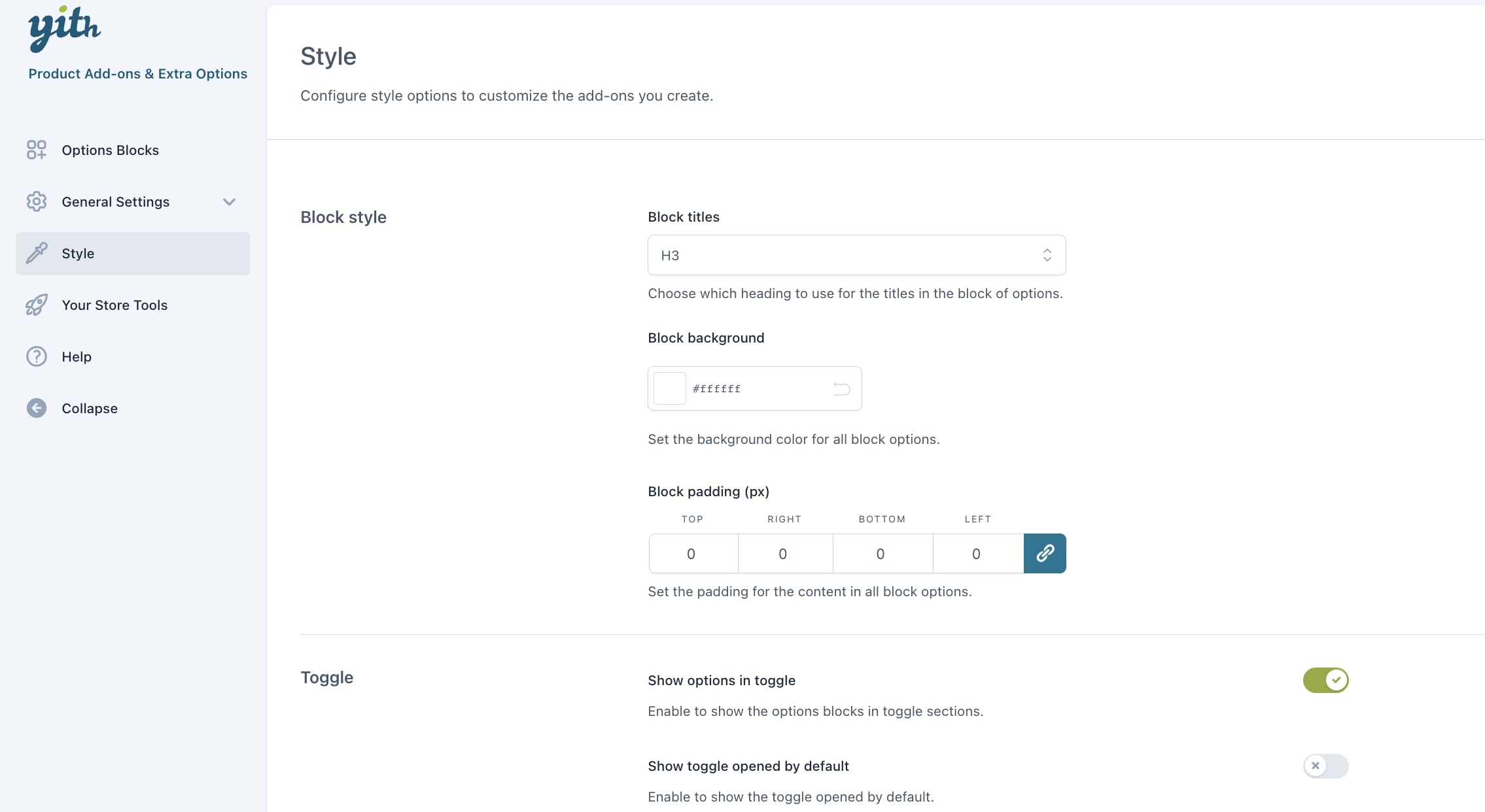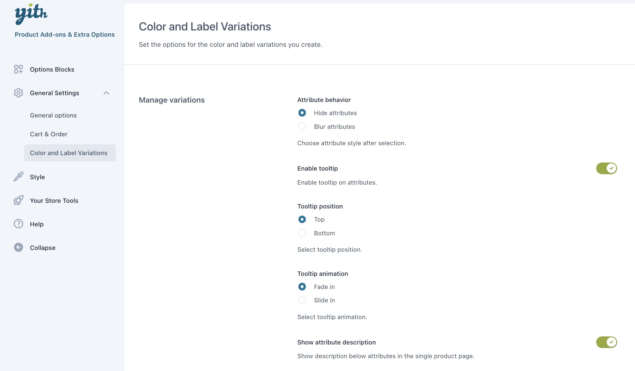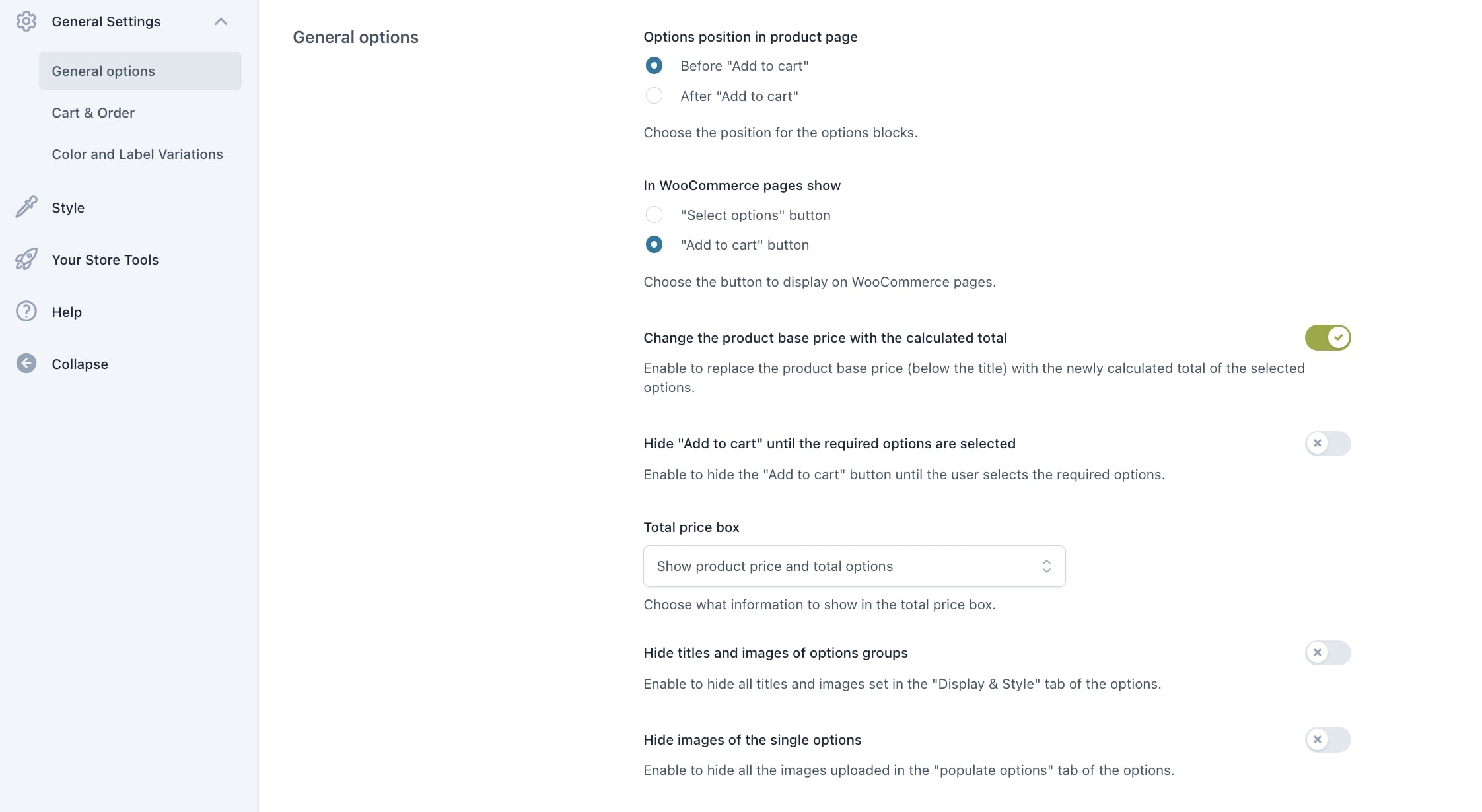 Nel plugin troverai tantissime opzioni per personalizzare i blocchi di opzioni. Potrai scegliere di utilizzare lo stile del tema (per checkbox, radio, select etc.) o di utilizzare lo stile incluso nel plugin; potrai modificare i colori (colore di sfondo dei blocchi, colore che identifica l’opzione selezionata etc.), scegliere se mostrare o meno i tooltip e impostarne posizione e colore, scegliere se mostrare le opzioni in un toggle (aperto o chiuso di default) o meno e molto altro ancora.