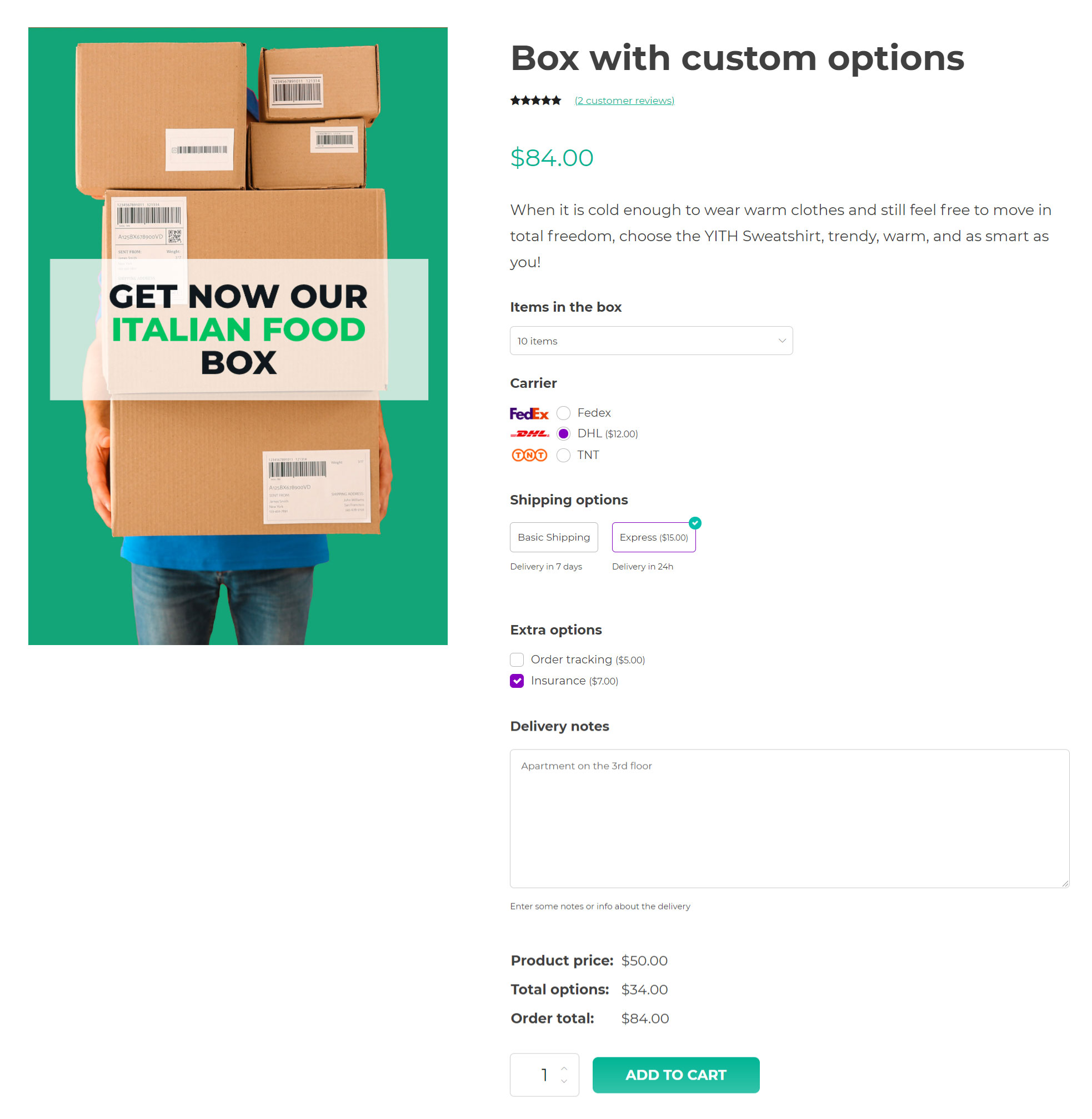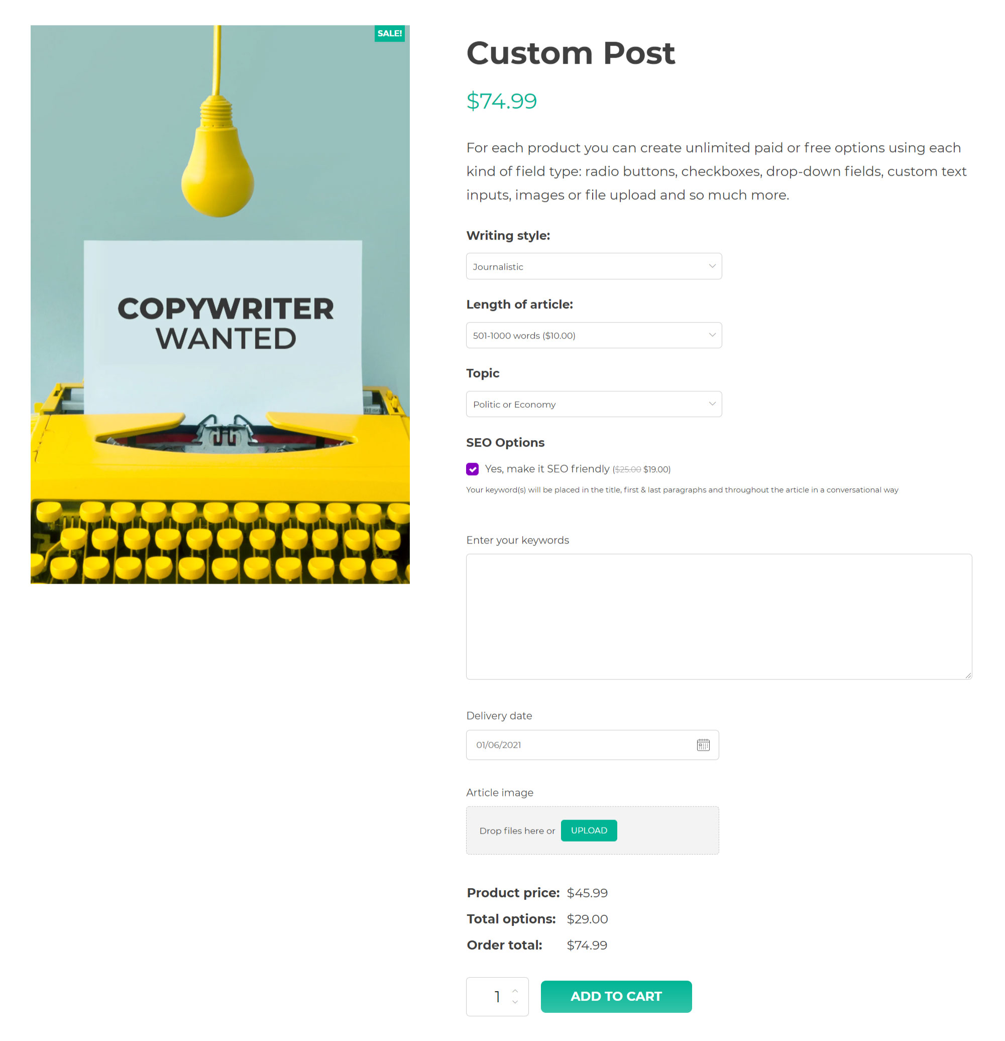 YITH WooCommerce Product Add-ons & Extra Options ti permette di creare blocchi di opzioni da inserire nei tuoi prodotti. Crei un blocco e lo popoli con le opzioni che ti servono scegliendo da una vasta libreria di elementi disponibili (input, textarea, select, checkbox, immagini, label, radio, campi upload, campi di selezione data etc.). Per ogni opzione scegli l’eventuale prezzo aggiuntivo (che verrà sommato al prezzo originale del prodotto) e in pochi minuti sei pronto a vendere prodotti complessi o personalizzabili e a offrire qualsiasi tipo di servizio accessorio ai tuoi clienti.