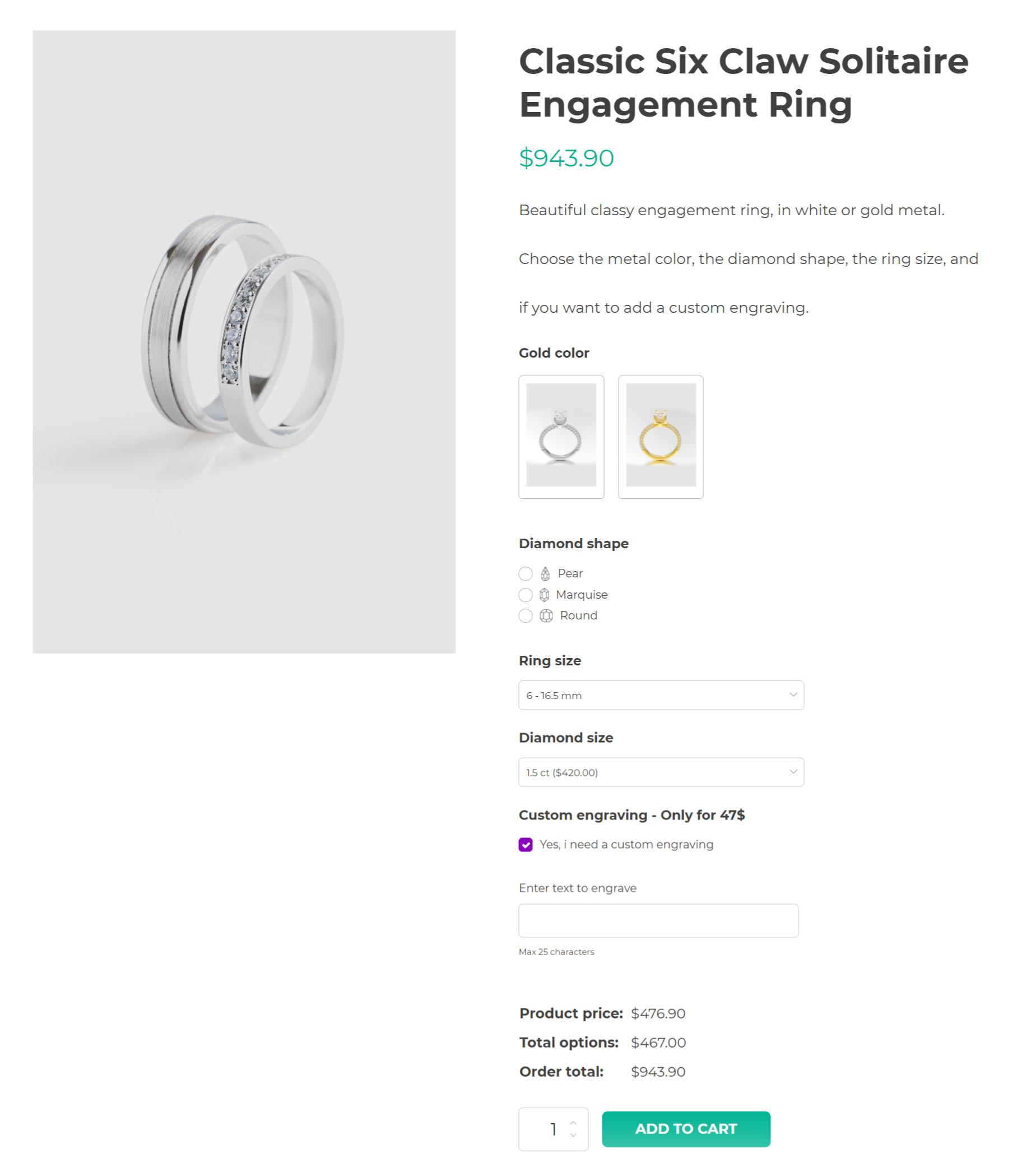 Ma non basta. Se vendi online avrai sicuramente bisogno di opzioni molto più avanzate. Ad esempio se vendi anelli o gioielli potresti voler permettere ai tuoi clienti di inserire un testo personalizzato da incidere sul gioiello, o scegliere i carati di una pietra preziosa, la misura, il colore dell’oro.