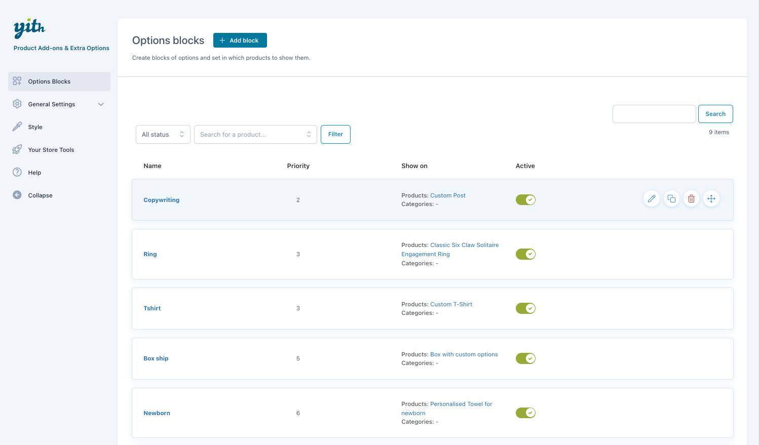 Crea infiniti blocchi di opzioni da mostrare in prodotti o categorie di prodotto diverse