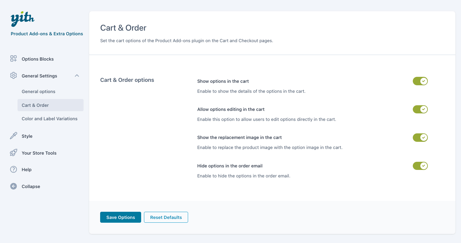 Scegli se nel carrello vuoi mostrare solo le informazioni relative al prodotto o se vuoi che siano visibili anche le opzioni selezionate dall’utente. Allo stesso modo puoi scegliere se mostrare o nascondere tali informazioni in tutte le e-mail relative dell’ordine.
