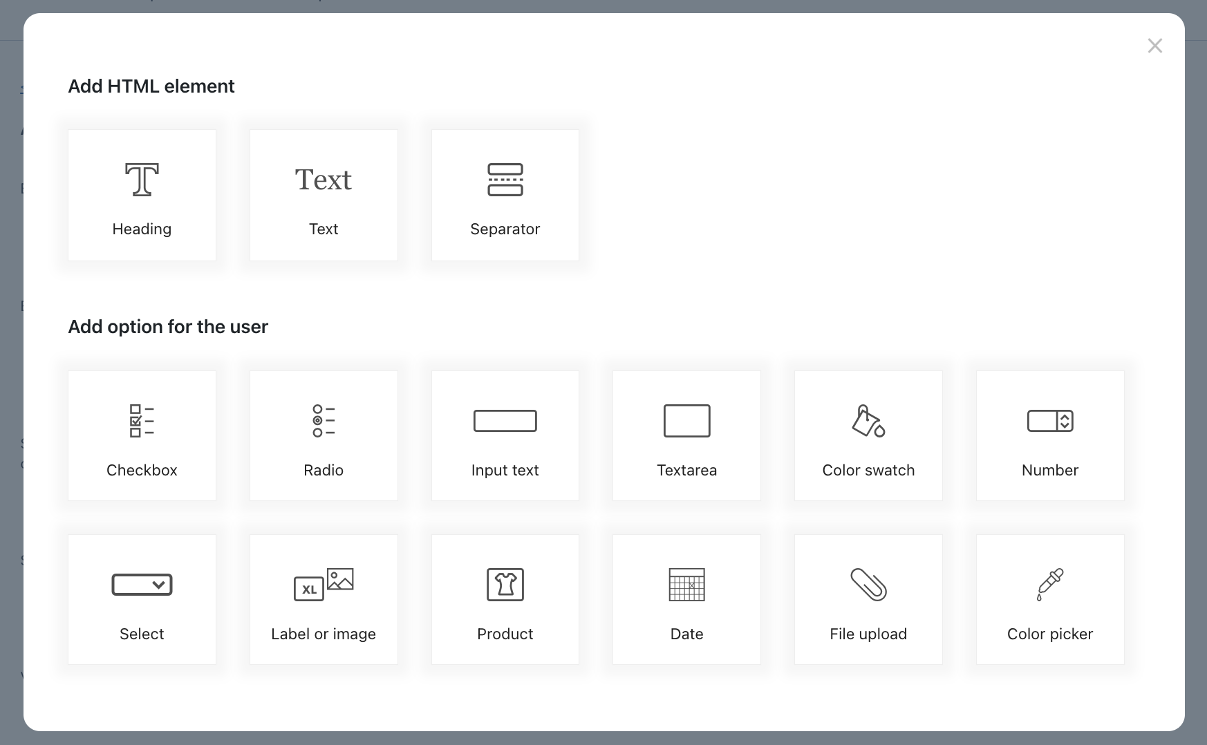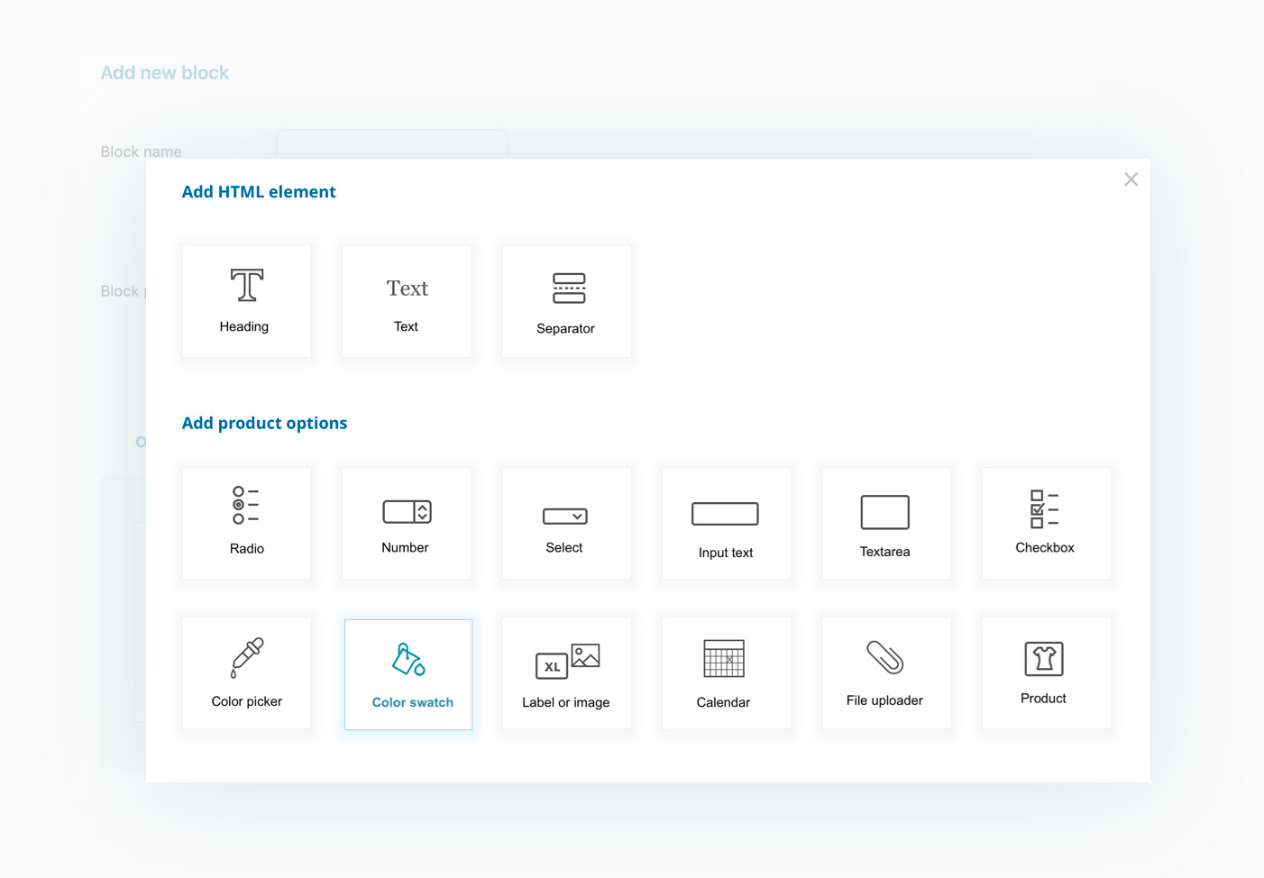 Scegli nella libreria di opzioni quali vuoi inserire nel blocco. Per rappresentare le opzioni puoi utilizzare checkbox, select, radio, campi di caricamento file, textarea, campi input, campioni colore, etichette testuali o con immagini, campi di selezione data e molto altro ancora.