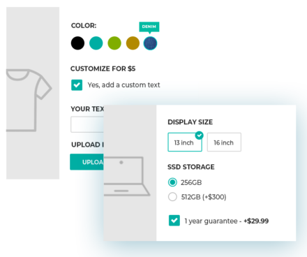 Se vendi magliette, tazze e altri accessori personalizzati hai senz’altro bisogno di un campo file per permettere ai tuoi clienti di caricare le loro foto direttamente durante l’acquisto del prodotto; se hai un e-commerce di prodotti tecnologici potresti offrire servizi di assistenza e garanzia ad un costo aggiuntivo o permettere all’utente di selezionare una gran quantità di opzioni come RAM, processore, dimensione dello schermo, peso, etc.