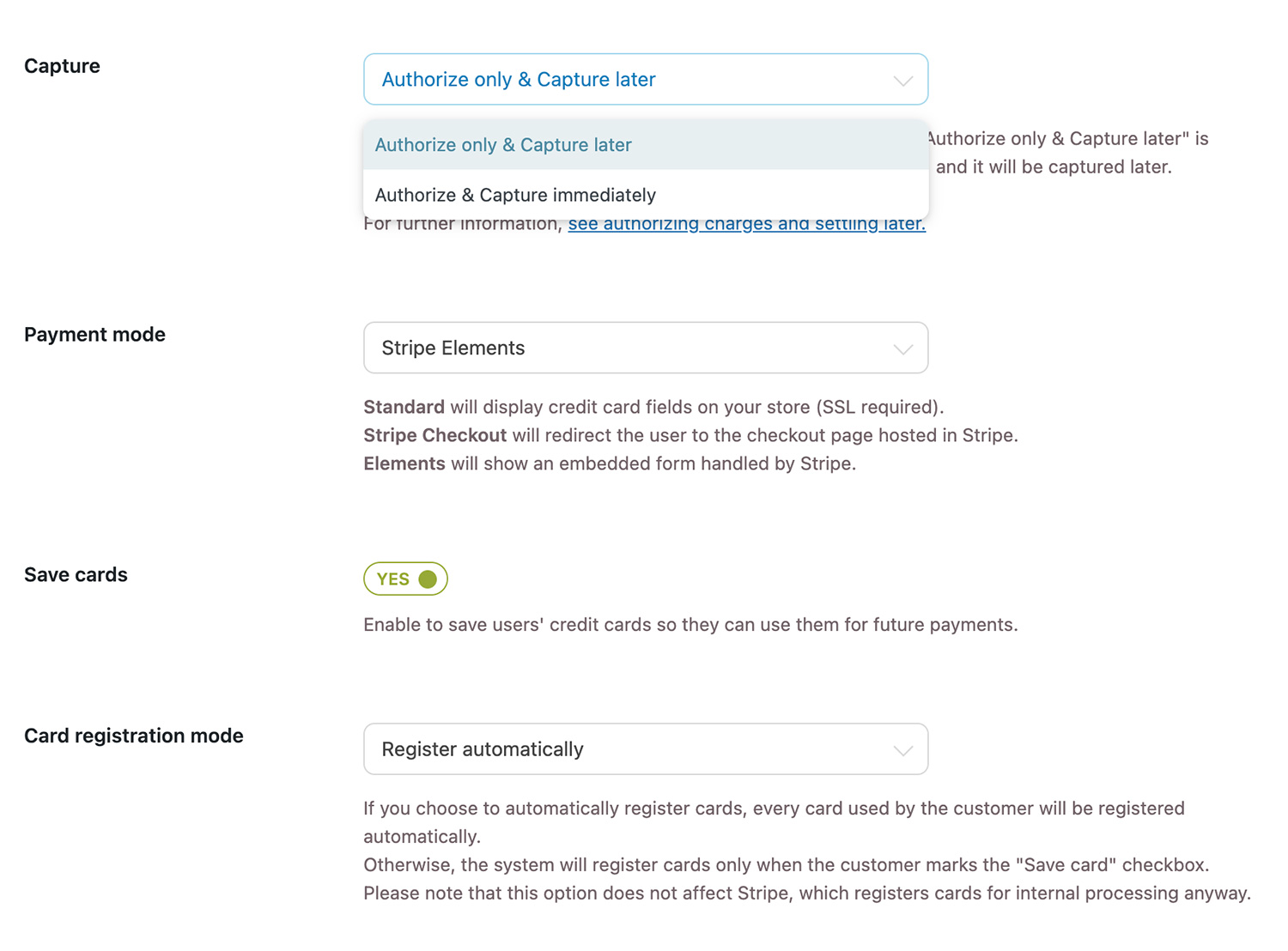 Utilizza l’apposita opzione per scegliere se addebitare il pagamento non appena il cliente effettua l’acquisto o se autorizzare il pagamento e addebitare l’importo successivamente, ad esempio una volta effettuata la spedizione dei prodotti.