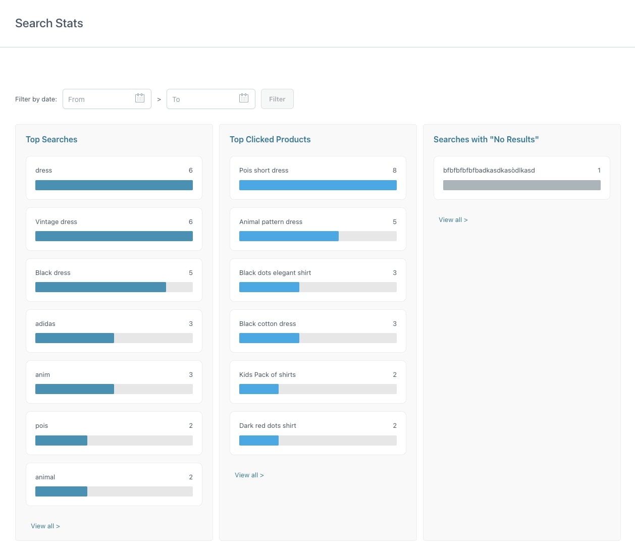 Thanks to the plugin’s built-in dashboard, you can get a general overview of the searches performed in your store and analyze the most popular search keywords, the most clicked-on products, and the searches that returned no results. This data can help you determine which products to promote in the results and which errors to fix to enhance your customer’s experience.