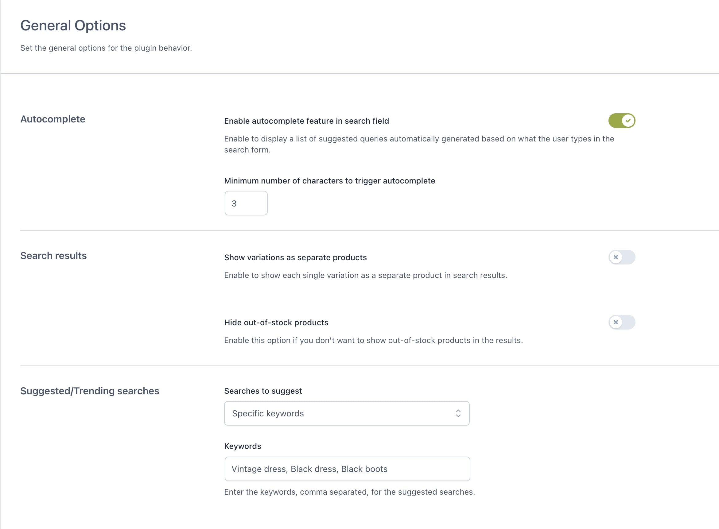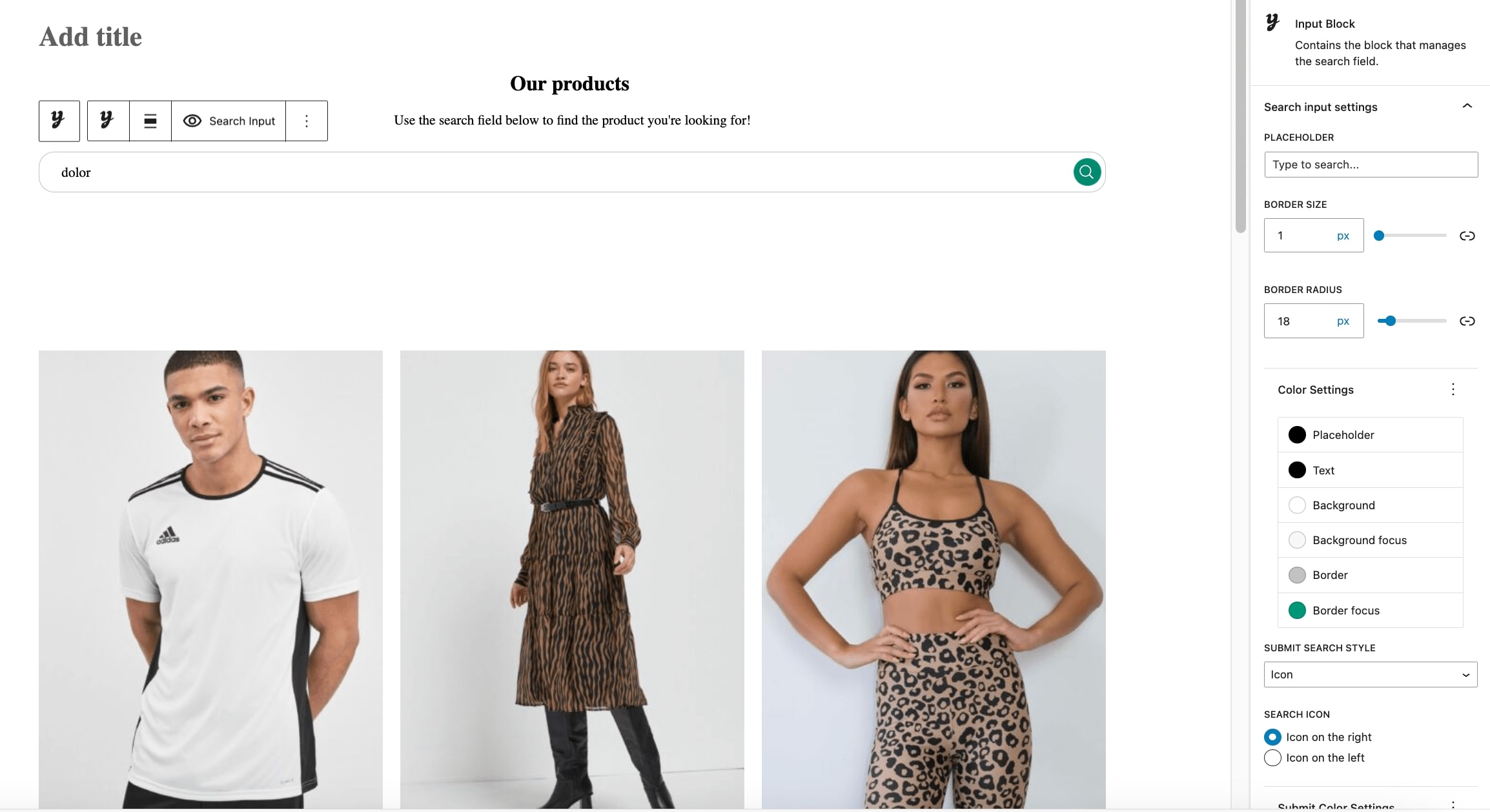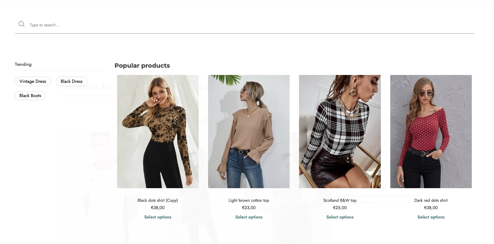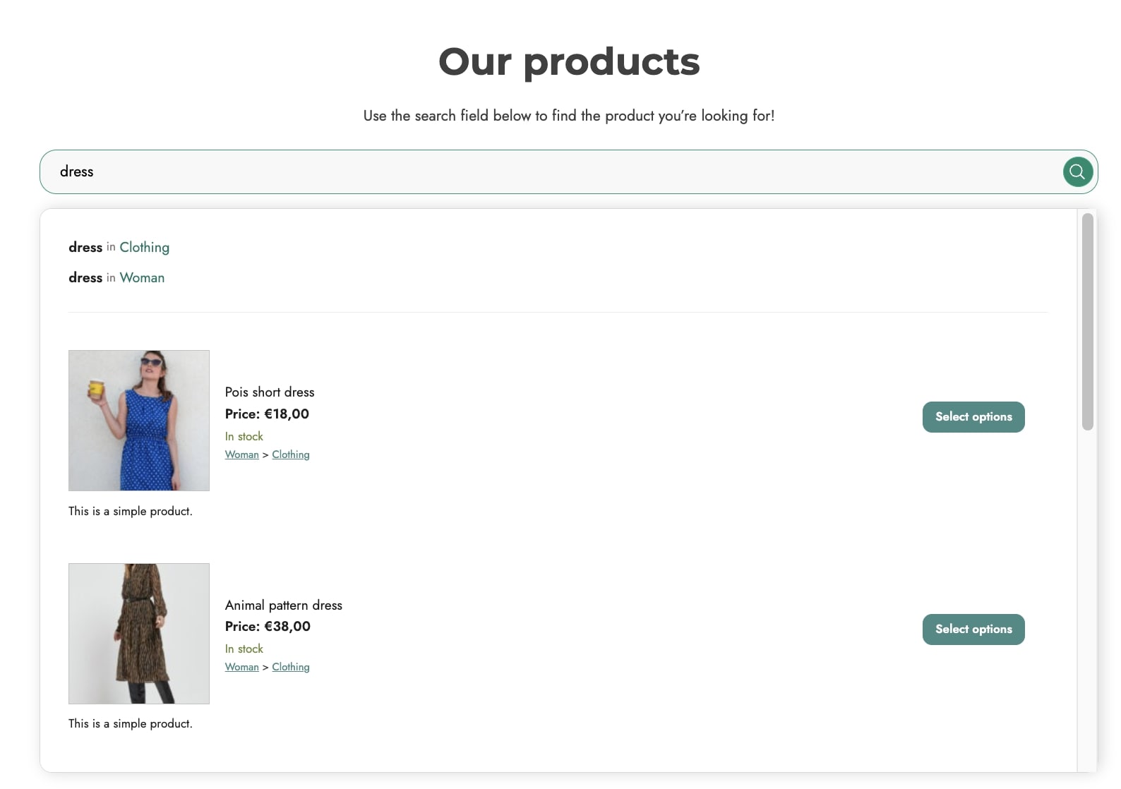 It’s not just about the products: do you have interesting content on your shop (posts, guides, refund policy, size charts, etc.) that you want to show to your customers? With just one click you can extend the search to posts and pages as well.