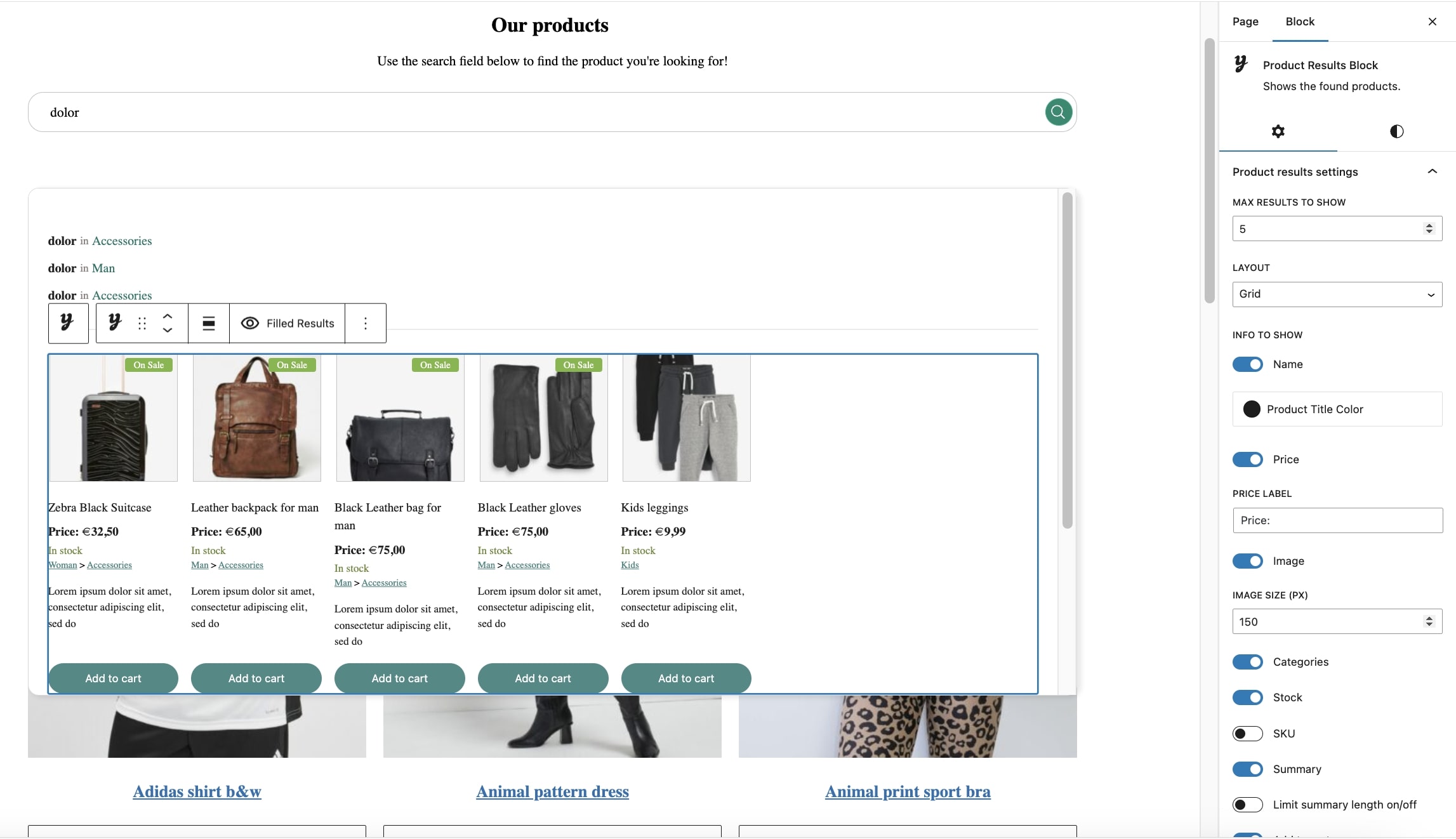 Choose how many results to show and whether to show them in a “list” layout (one below the other) or in a “grid” layout (arranged next to each other). Set which product information to show (image, price, stock, SKU, short description, “Add to cart” button, etc.) and use special badges for featured or discounted products. You can also hide out-of-stock products from search results or suggest search categories based on the keywords that the users enter… there are so many options, and all of them are designed to make your shop search feature even more powerful.