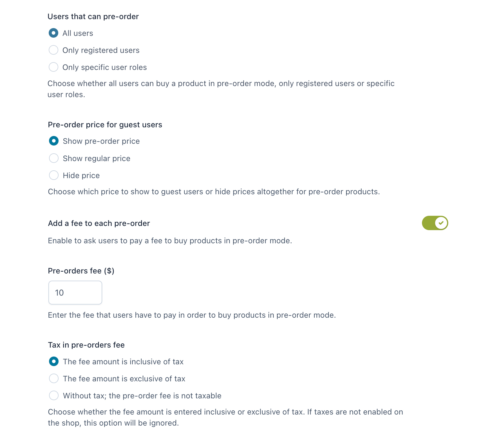Solicita a los usuarios que paguen una cuota adicional para reservar los productos y establecer el valor. Puedes establecer una cuota global para todos los pedidos de precompra y sobrescribirla con un valor diferente para productos específicos.