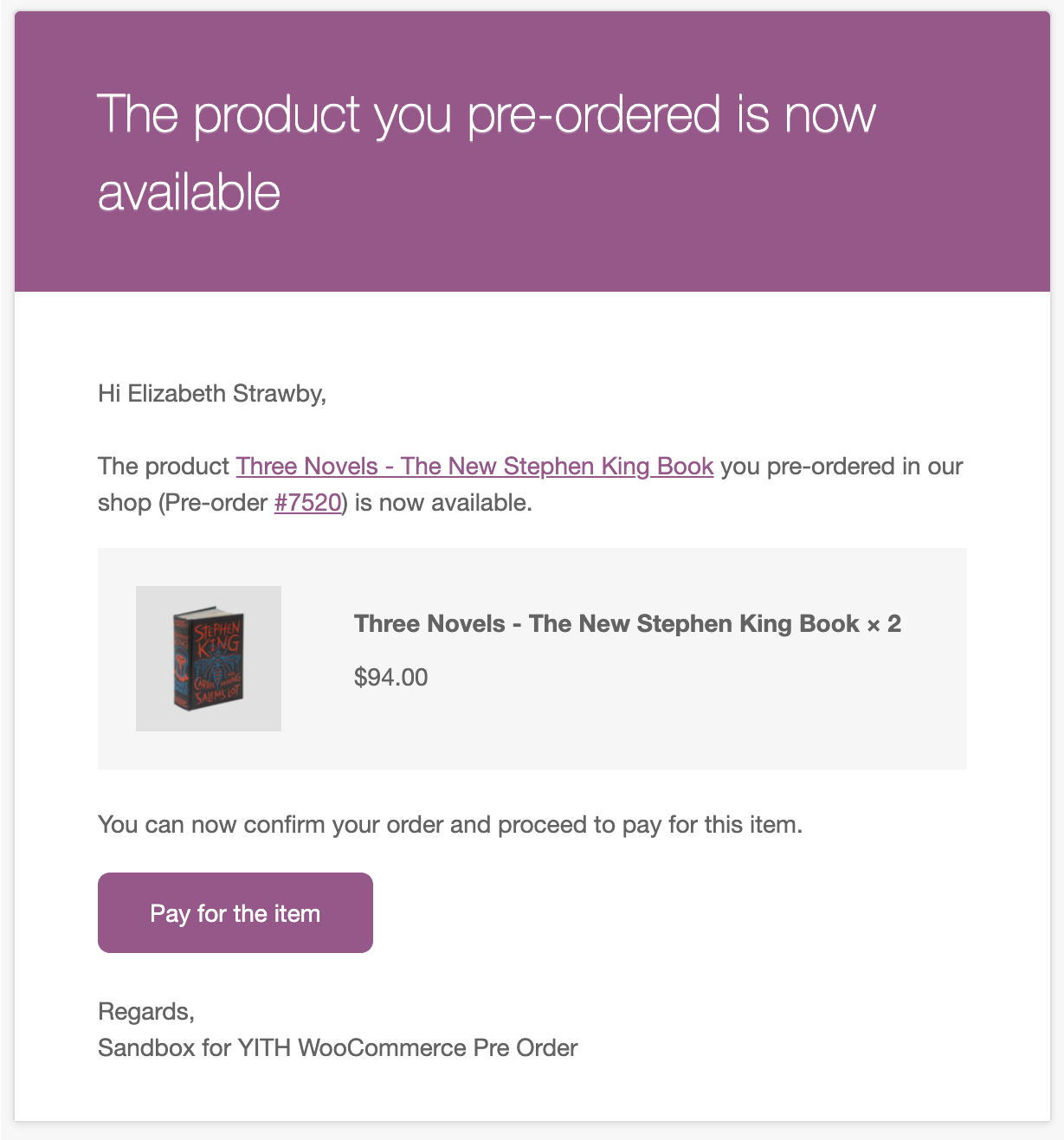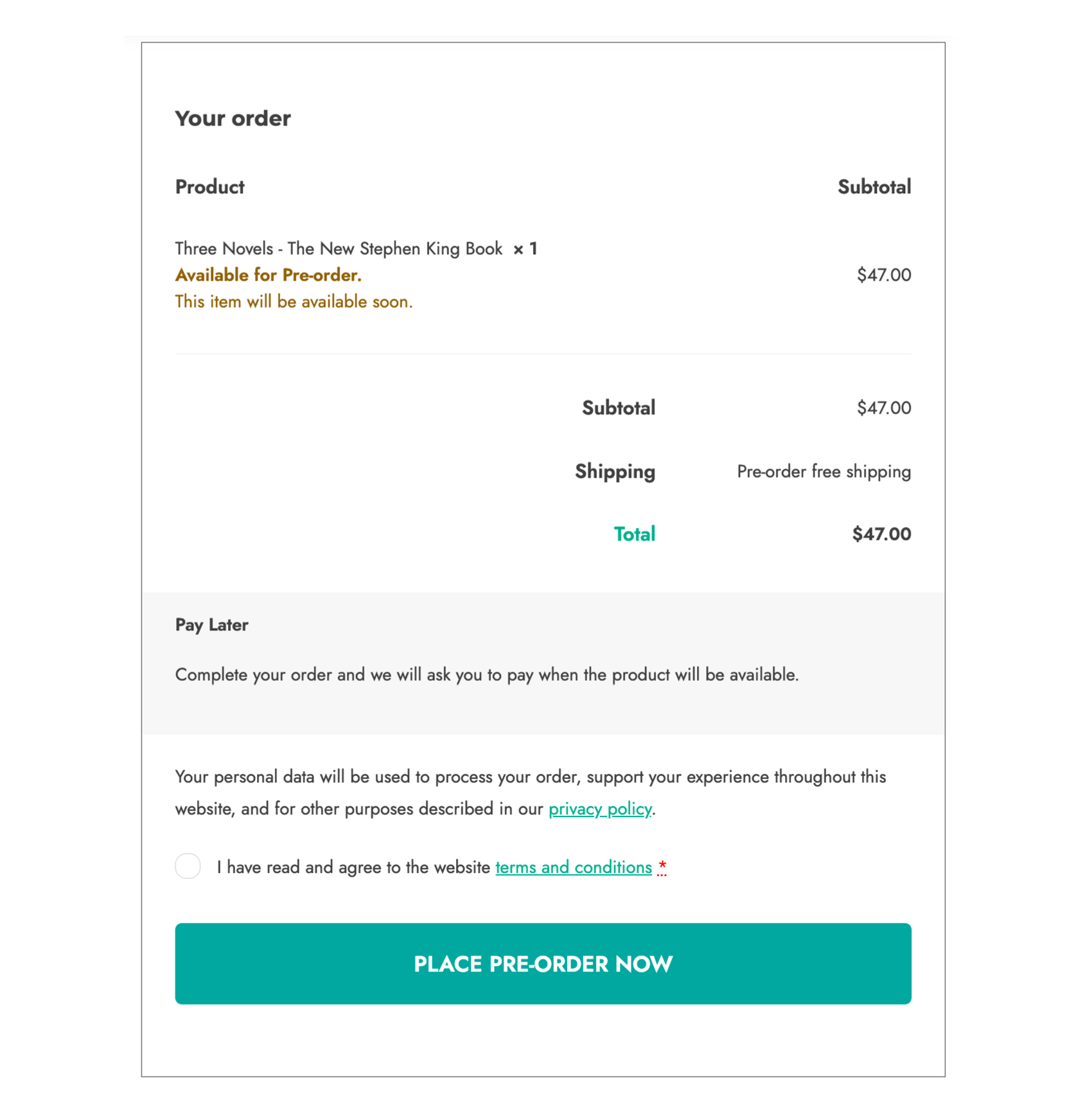 Si deseas ofrecer más libertad, permite que tus usuarios elijan la opción “Pagar más tarde” al finalizar la compra. Una vez que el producto esté disponible, recibirán un correo electrónico que les informará sobre la disponibilidad del producto y los redirigirá para pagar el pedido de precompra.