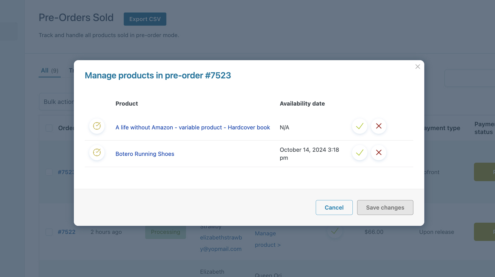 Gestiona pedidos de precompra y productos de precompra a través de las tablas correspondientes disponibles en el plugin